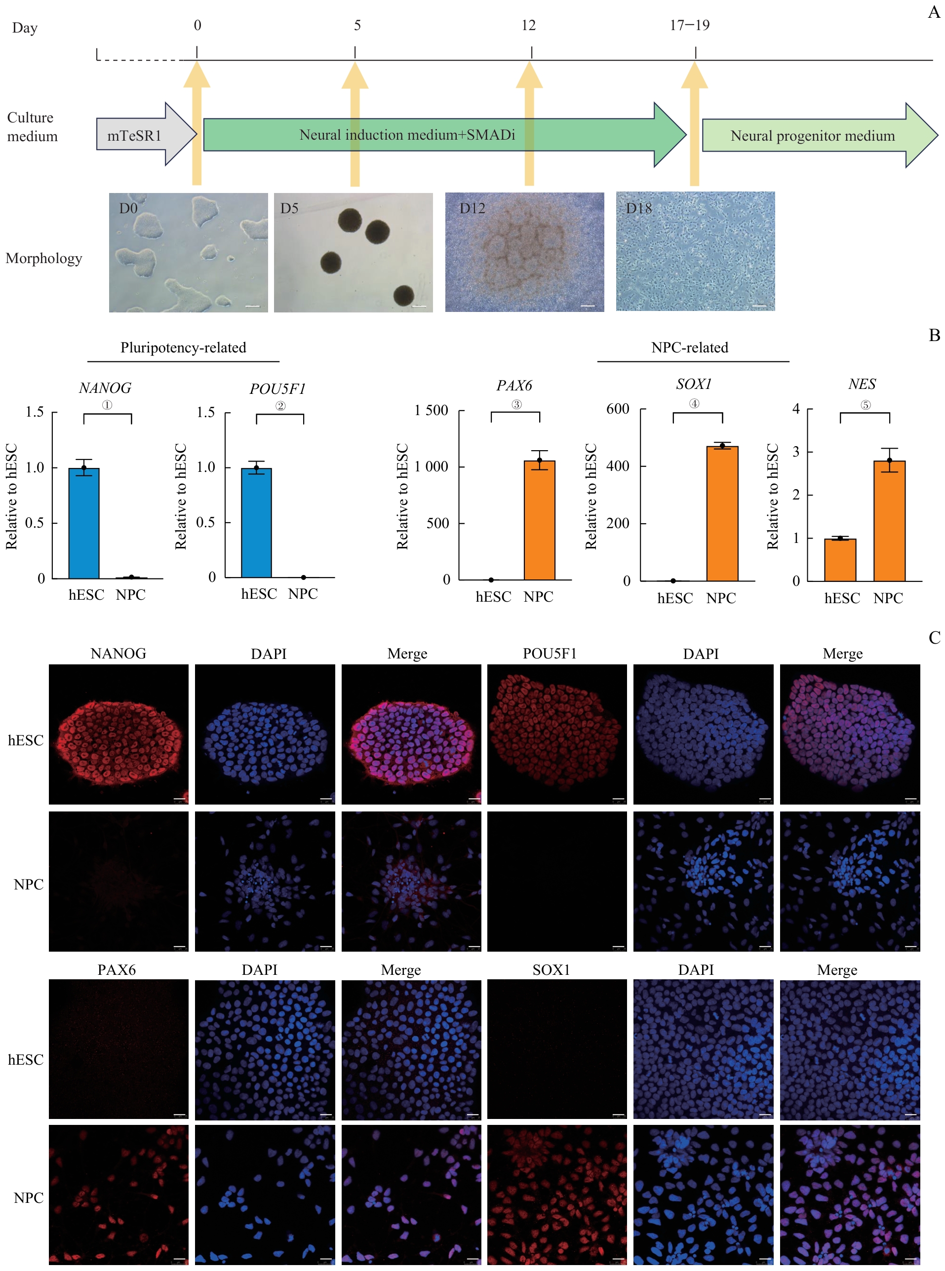 图1 利用双重SMAD抑制策略在体外将hESC分化成NPCNote:A. Schematic diagram of the NPC culture system and morphology of hESC-induced differentiation into NPCs. SMADi—SMAD inhibition. Scale bar=200 μm. B. The gene expression of typical genes related to pluripotency and NPCs during the induction process detected by RT-qPCR. ①P=0.002, ②P=0.001, ③P=0.002, ④P<0.001, ⑤P=0.006. NPCs were the cells induced for 27 d. C. Expression of hESC markers (NANOG and POU5F1) and NPC markers (PAX6 and SOX1), detected by immunofluorescence staining. NPCs were the cells induced for 27 d. Scale bar=25 μm.