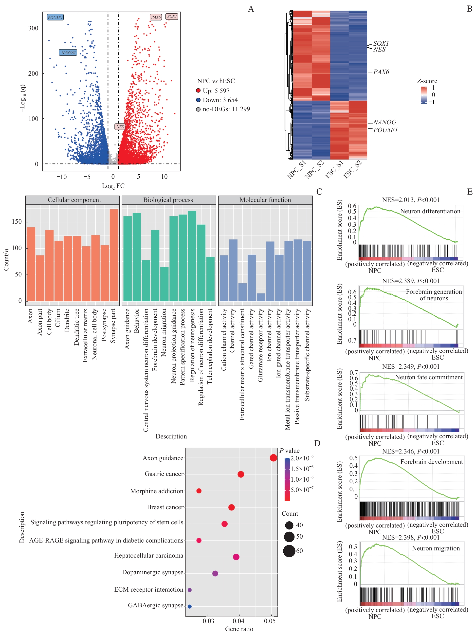 图3 NPC分化过程中转录组的分析Note: A. Volcano plot shows the distribution of DEGs between the two distinct developmental stages (ESC and NPC). DEGs were defined as |log2FC|>1 and P<0.05. B. Gene expression levels were clustered across all samples. Different colors indicate the value of each gene expression level normalized with Z-scores. C. GO analysis was performed on the DEGs upregulated at the NPC stage. D. KEGG analysis of the DEGs upregulated at NPC stage. E. GSEA analysis identifies pathways upregulated during NPC differentiation.