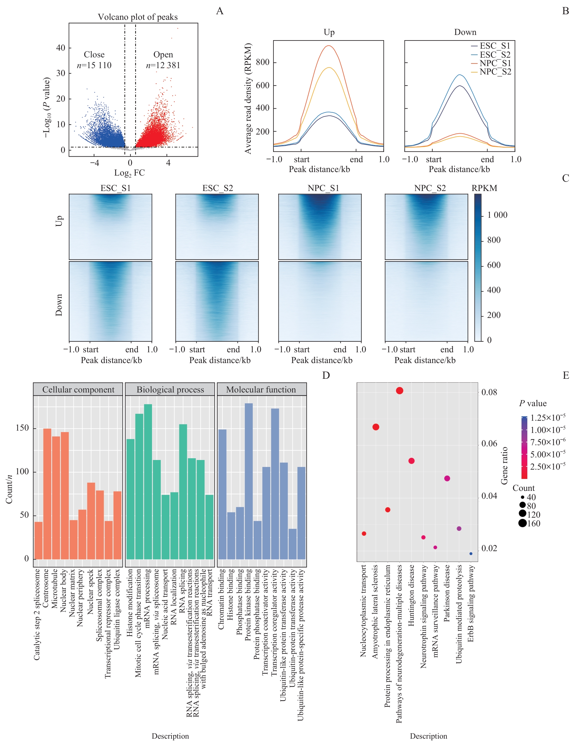 图4 NPC分化过程中染色质可及性分析Note: A. Volcano plot shows the peak signals of differentially open chromatin obtained from the ATAC-seq dataset. Differential open areas were defined as |log2FC| >0.585 and P<0.05. B. The differential region enrichment plot shows the average peak signal between different samples in the differentially upregulated region (left) and the differentially downregulated region (right) at the NPC stage. C. Differential region enrichment heatmap reveals peak signals within genomic region. D. GO analysis of genes associated with differentially open chromatin regions at the NPC stage. E. KEGG analysis of genes associated with differentially open chromatin regions at the NPC stage.