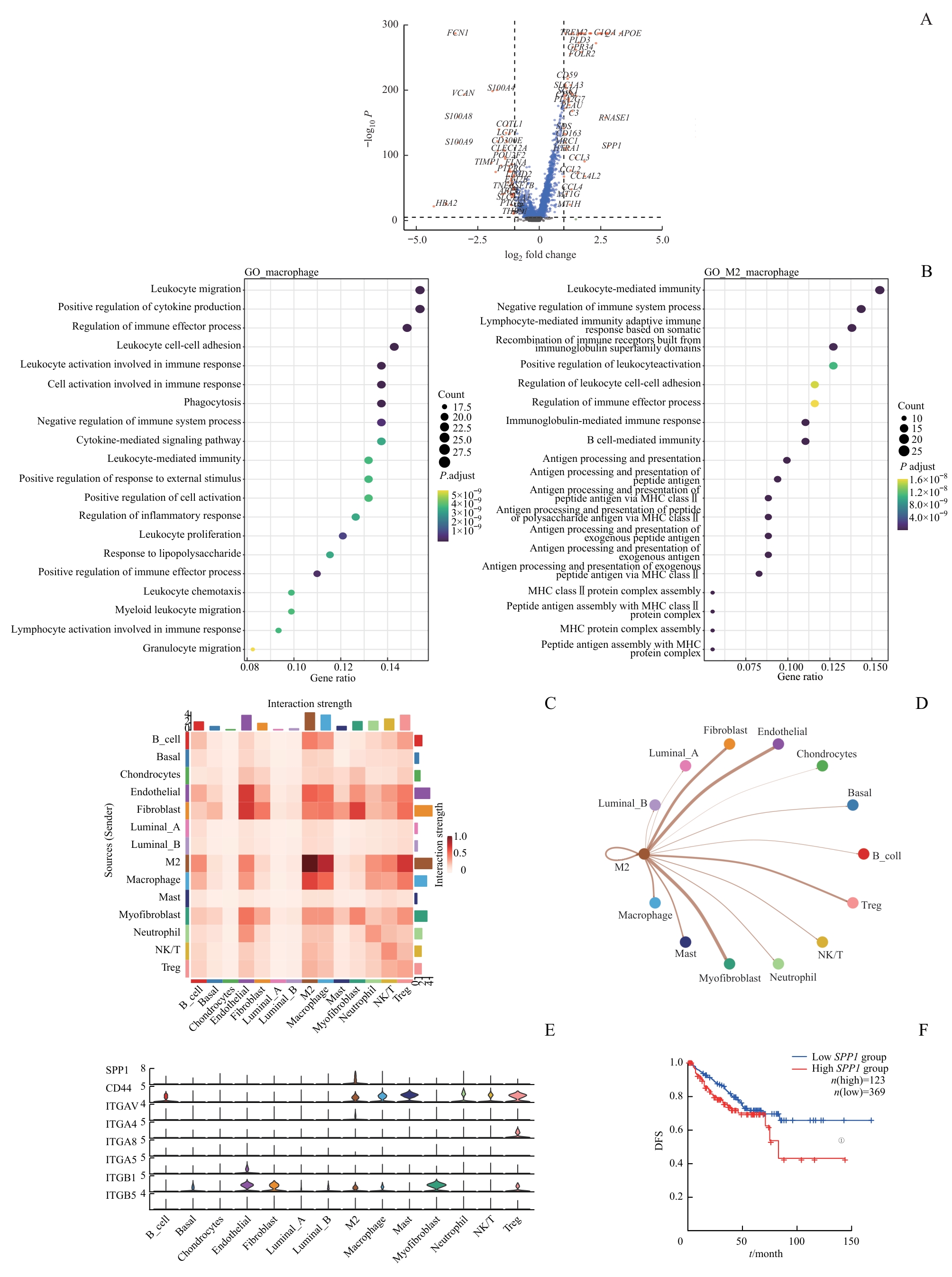 图2 TME中细胞间相互作用分析Note: A. Volcano plot illustrating the differentially expressed genes between M2 macrophages and non-M2 macrophages (genes with significant differences are highlighted in red; non-significant genes in blue). B. Gene enrichment analysis represented as a bubble diagram. C/D. Heatmap (C) and network plot (D)visualizing cell communication in sc-RNA seq. E. Violin plot indicating the predominant secretion of SPP1 by M2 macrophages. F. Kaplan-Meier survival curve showing DFS difference between high and low SPP1 expression groups in the TCGA cohort. ①P=0.034.