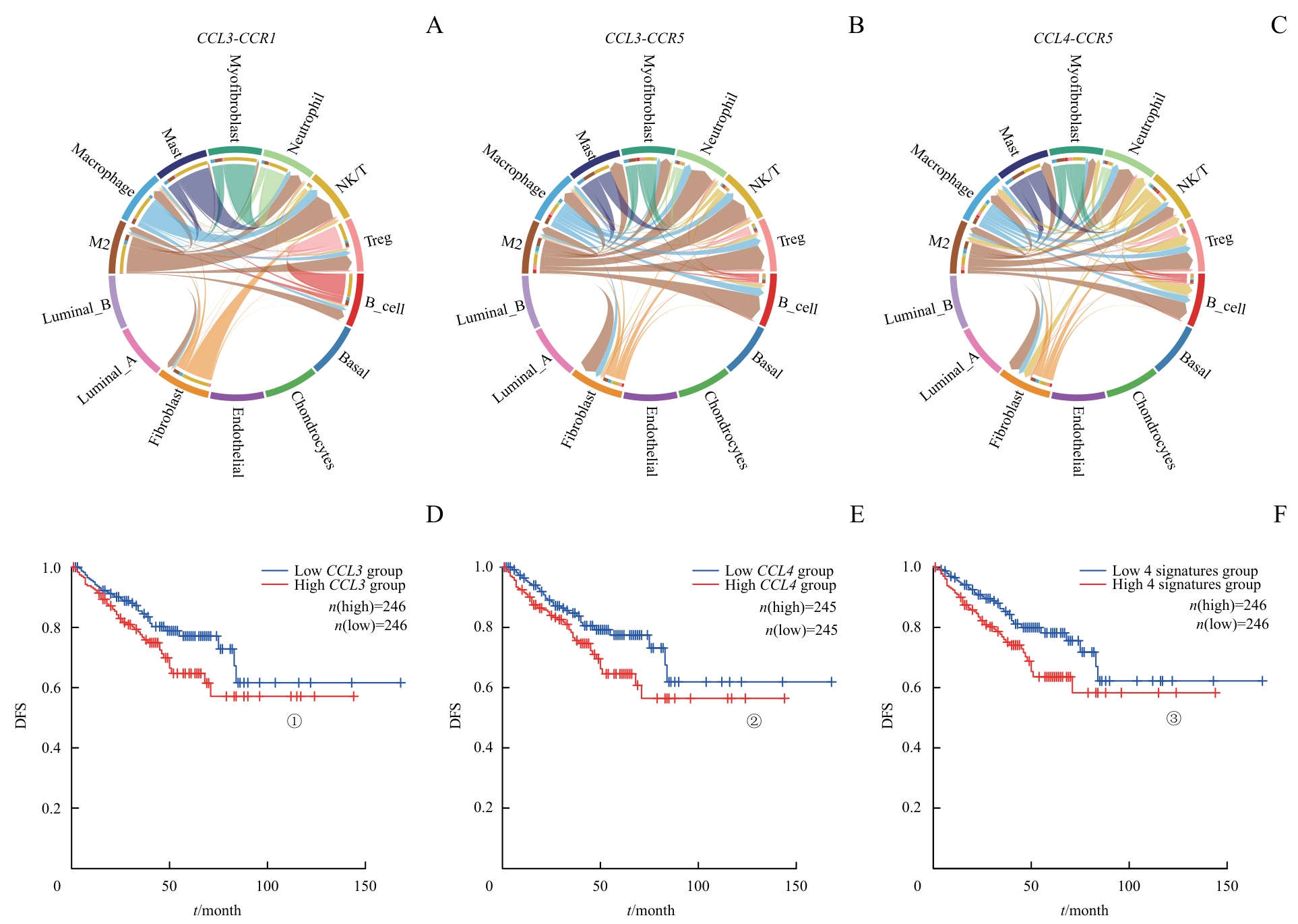 图3 M2巨噬细胞与TME中其他细胞交互的主要通路Note: A‒C. The signals of CCL3 and CCL4 from M2 macrophages primarily targeted NK/T cells, Treg cells and B cells in PCa. D‒F. DFS differences based on these pathways. ①P=0.036, ②P=0.032, ③P=0.013.