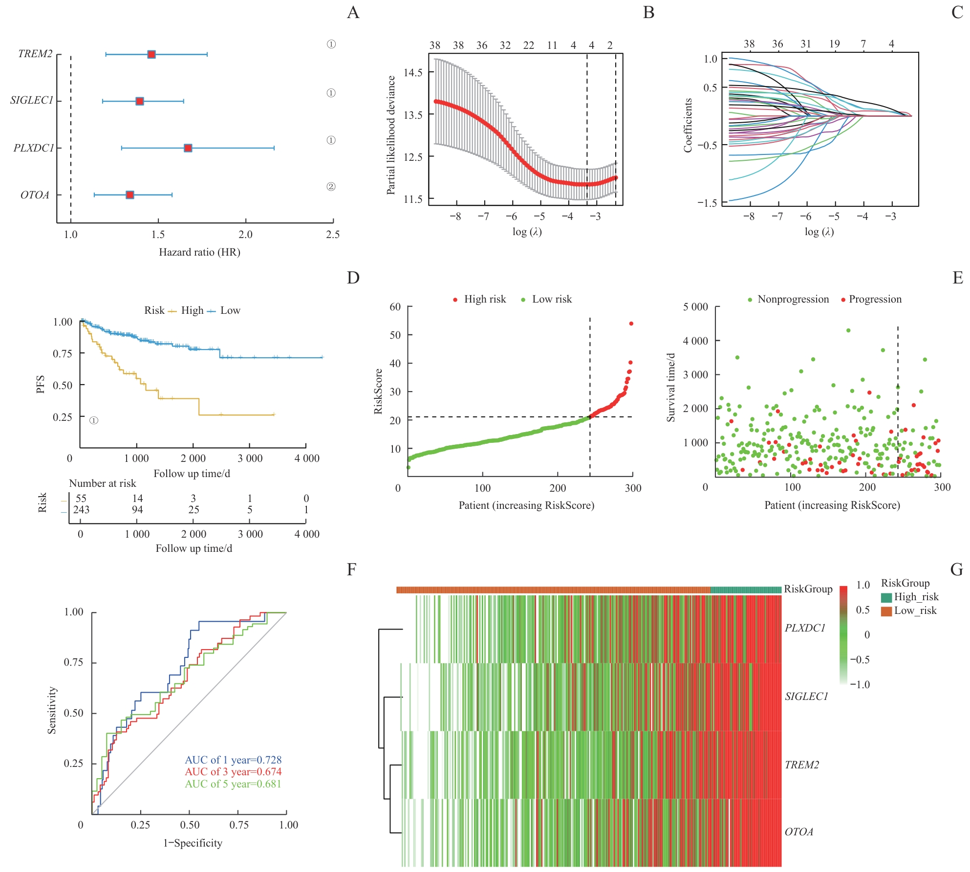 图4 PCa预后模型的构建与测试Note: A. The construction of a LASSO regression model based on four characteristic genes (TREM2, OTOA, SIGLEC1, and PLXDC1). B. Identification process of genes for construction of prognostic risk score signature. C. The coefficients in LASSO Cox regression analysis of the 38 prognostic M2 macrophages-related genes. D. The comparison of PFS between low- and high-risk score groups in the training set. E. The distribution of risk scores ranked from low to high and the comparison of survival status between low- and high- risk score groups in the training set. F. The prediction accuracy of the risk score measured by ROC curves at 1, 3, 5 years in the training set. The AUC values are 0.728, 0.674, 0.681 respectively. ①P<0.001, ②P=0.001.