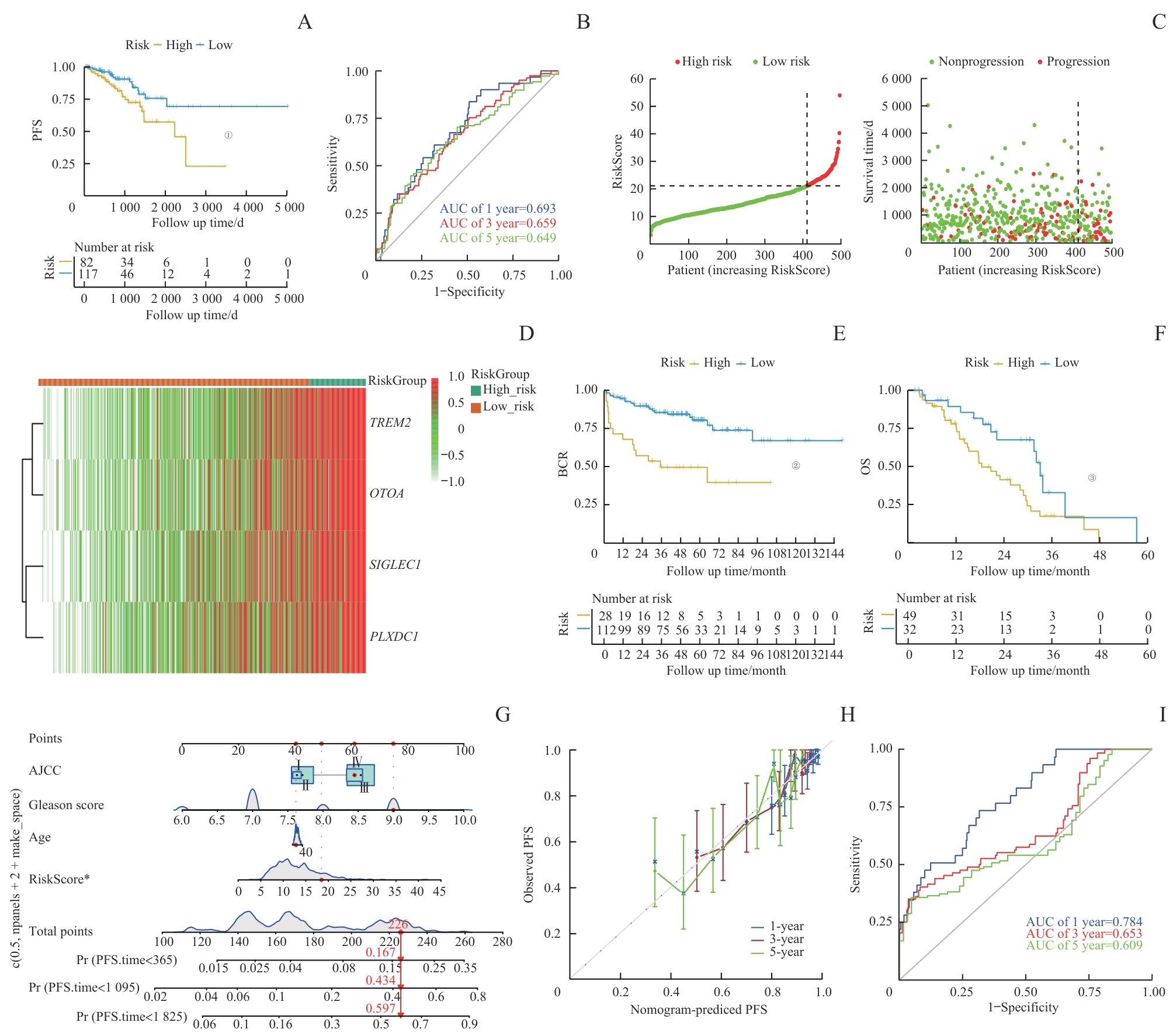 图5 通过外部数据库对预后模型进行验证Note: A. The comparison of PFS between low- and high-risk score groups in the test set. B. The prediction accuracy of the risk score measured by ROC curves at 1, 3, 5 years in the test set. The AUC values were 0.693, 0.659, and 0.649 for 1, 3, and 5 years, respectively. C. Distribution of risk in ascending order and comparison of survival status between low- and high- risk score groups in the test set. D. The heatmap of four signature genes between high- and low-risk group. E/F. The comparison of BCR (E) and OS (F) between low- and high-risk score groups in the SU2C/PCF Dream Team cohort. G. Nomogram for predicting PFS of patients in training set. H. The calibration plots of the nomogram at 1, 3, 5 years. The x coordinate value represents the nomogram-predicted survival, and the y coordinate value represents observed PFS. I. ROC curves for nomogram at 1, 3, 5 years. ①P=0.018, ②P<0.001, ③P=0.013.