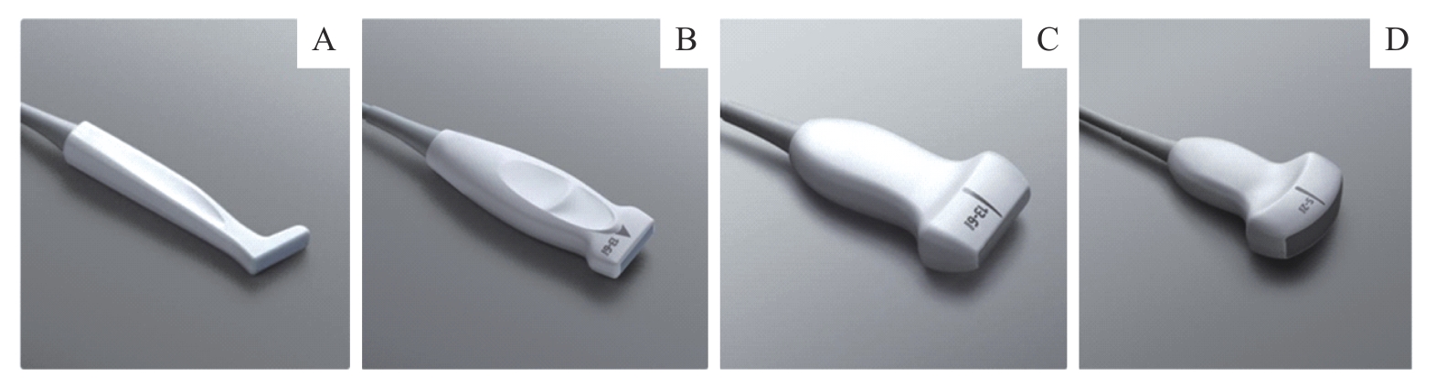 图1 儿童神经阻滞常用超声探头Note: A. 2.5 cm高频线阵探头(L型)/2.5 cm L-type high-frequency linear array probe. B. 2.5 cm高频线阵探头/2.5 cm high-frequency linear array probe. C. 3.5 cm高频线阵探头/3.5 cm high-frequency linear array probe. D. 低频凸阵探头/low-frequency convex array probe.