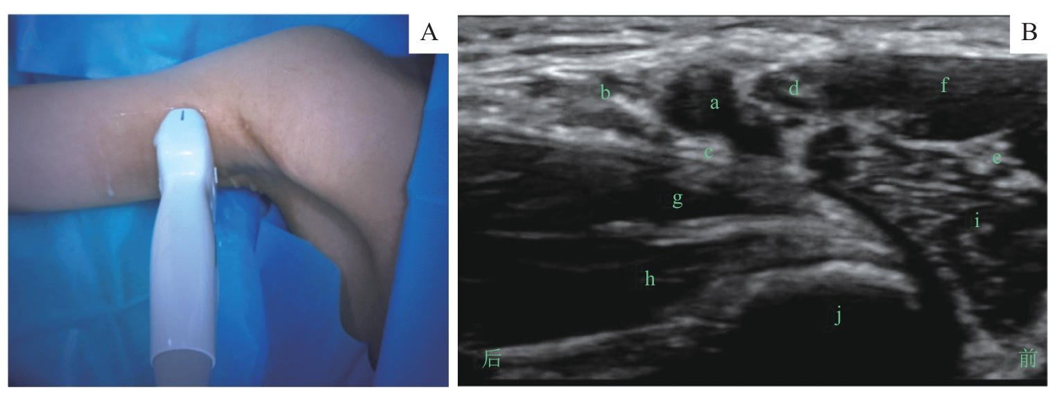 图2 腋路臂丛阻滞的超声定位和影像Note: A. 超声探头体表扫描定位/Surface scanning for ultrasound probe positioning. B. 探头处于图A位置时的腋路臂丛超声影像/Ultrasound image of the axillary brachial plexus obtained with the probe positioned as shown in figure A. a—腋动脉/axillary artery; b—尺神经/ulnar nerve; c—桡神经/radial nerve; d—正中神经/median nerve; e—肌皮神经/musculocutaneous nerve; f—肱二头肌/biceps brachii muscle; g—背阔肌大圆肌联合腱/the latissimus dorsi and teres major tendons; h—肱三头肌/triceps brachii muscle; i—喙肱肌/brachii muscle; j—肱骨/brachialis muscle.