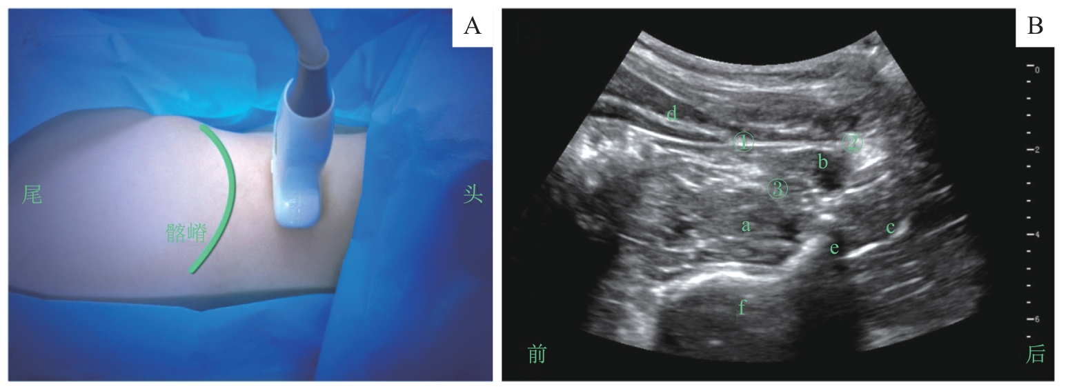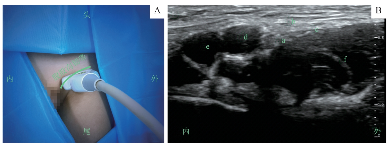图3 股神经阻滞的超声定位和影像Note: A. 超声探头体表扫描定位/Surface scanning for ultrasound probe positioning. B. 探头处于图A位置时的股神经超声影像/Ultrasound image of the femoral nerve obtained with the probe positioned as shown in figure A. a—股神经/femoral nerve; b—阔筋膜/fascia lata; c—髂筋膜/fascia iliac; d—股动脉/femoral artery; e—股静脉/femoral vein; f—髂腰肌/iliopsoas muscle.
