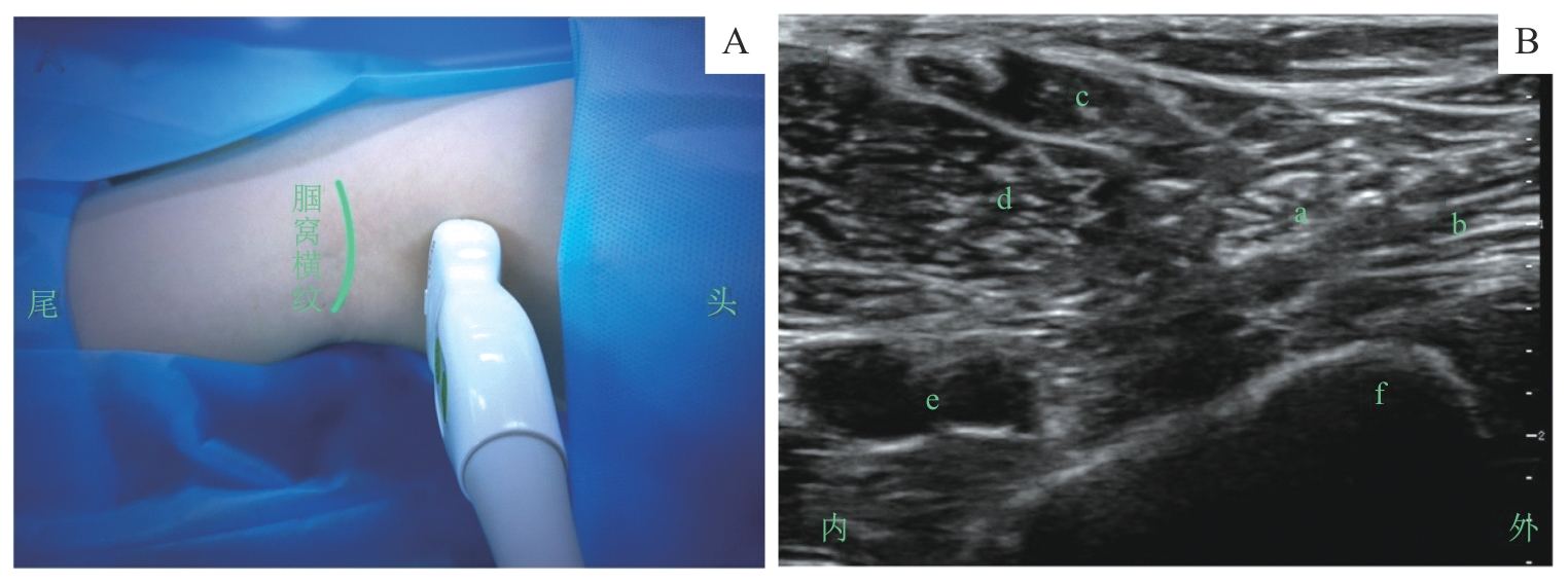 图4 腘窝坐骨神经阻滞的超声定位和影像Note: A. 超声探头体表扫描定位/Surface scanning for ultrasound probe positioning. B. 探头处于图A位置时的腘窝坐骨神经超声影像/Ultrasound image of the sciatic nerve in the popliteal fossa obtained with the probe positioned as shown in figure A. a—坐骨神经/sciatic nerve; b—股二头肌/biceps femoris muscle; c—半腱肌/semitendinosus muscle; d—半膜肌/semimembranosus muscle; e—腘动、静脉/popliteal artery and vein; f—股骨/femur.