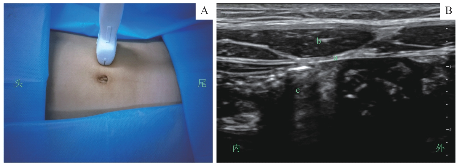 图5 腹直肌鞘阻滞的超声定位和影像Note: A. 超声探头体表扫描定位/Surface scanning for ultrasound probe positioning. B. 探头处于图A位置时的腹直肌鞘超声影像/Ultrasound image of the rectus sheath obtained with the probe positioned as shown in figure A. a—腹直肌后鞘/posterior sheath of rectus abdominis muscle; b—腹直肌/rectus abdominis muscle; c—腹腔/abdominal cavity.