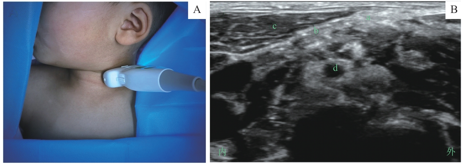图7 颈浅丛阻滞的超声定位和影像Note: A. 超声探头体表扫描定位/Surface scanning for ultrasound probe positioning. B. 探头处于图A位置时的颈浅丛超声影像/Ultrasound image of the superficial cervical plexus obtained with the probe positioned as shown in figure A. a—颈浅丛/superficial cervical plexus; b—颈深筋膜/deep cervical fascia; c—胸锁乳突肌/sternocleidomastoid muscle; d—C5神经根/C5-nerve root.