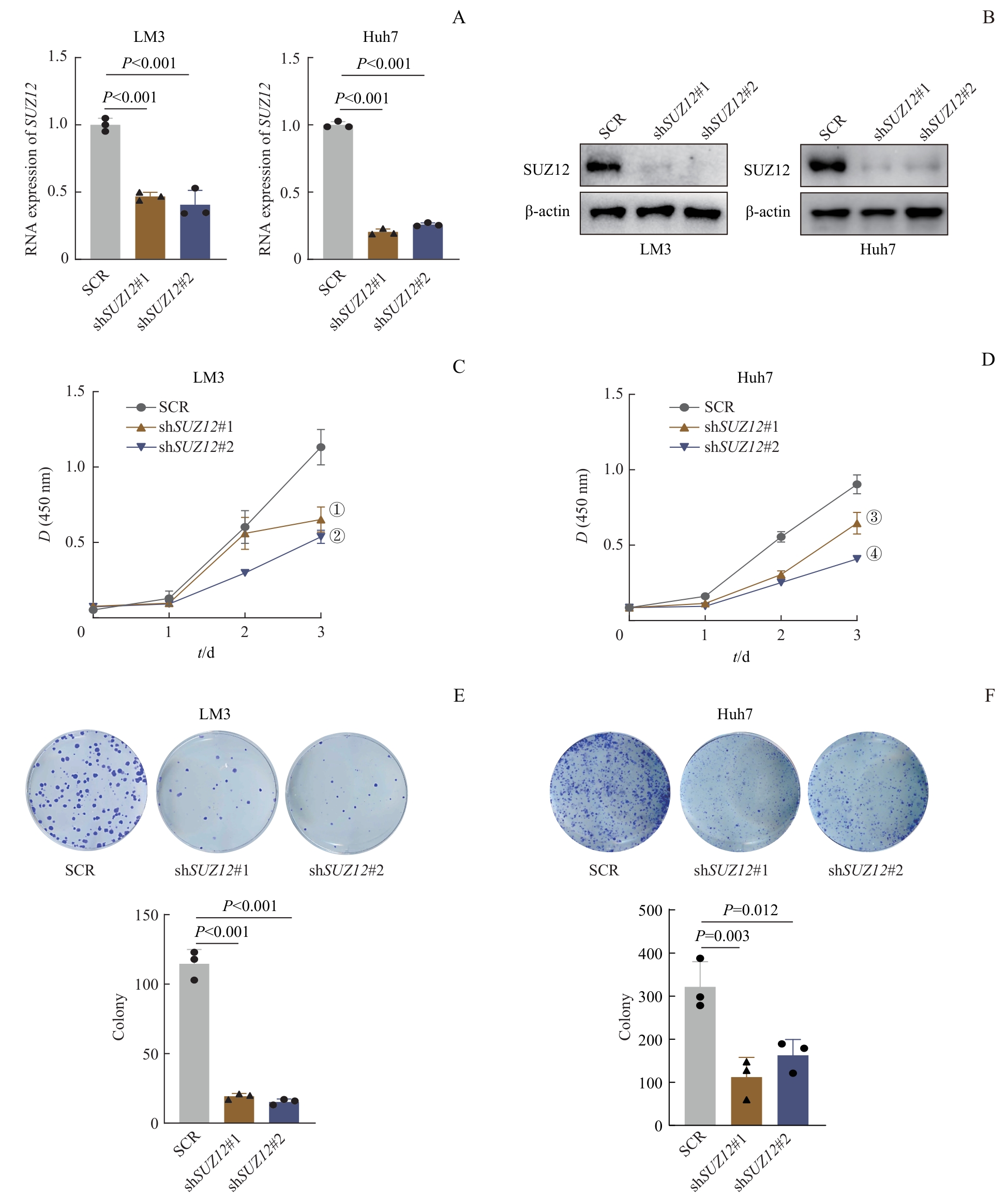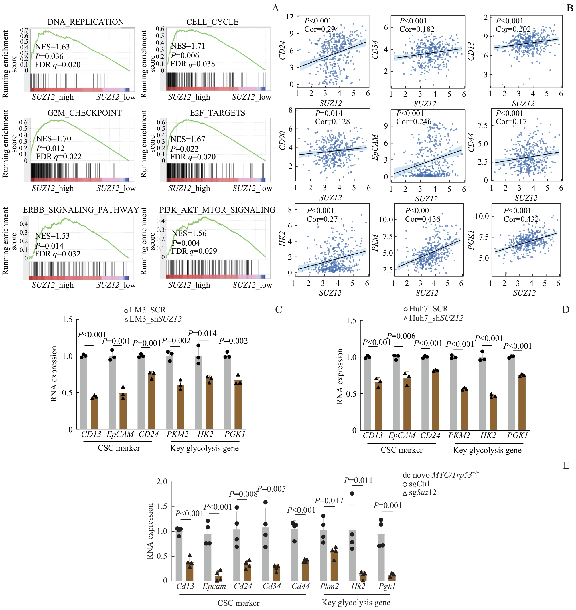 Objective ·To explore the function and potential mechanism of suppressor of zeste 12 (SUZ12) in hepatocellular carcinoma (HCC). Methods ·The expression of SUZ12 in HCC patients was analyzed using R language in liver cancer datasets, and relevant survival curves were drawn. Stable knockdown of SUZ12 was established in the liver cancer cell lines LM3 and Huh7. The knockdown efficiency of SUZ12 was assessed using quantitative real-time PCR (qPCR) and Western blotting. Cell proliferation ability was assessed using CCK-8 assay and colony formation assay. Using the hydrodynamic tail vein injection (HTVI) method, Suz12 was knocked out in the livers of fully immunocompetent mice to explore its tumorigenic function in vivo. The molecular mechanism of SUZ12 regulating HCC was explored using The Cancer Genome Atlas (TCGA) database. R language was used to analyze the relationship between SUZ12 and the expression of cancer stem cell (CSC) markers as well as key glycolysis-related genes. Findings were validated in liver cancer cell lines and mouse tumor tissues. Results ·The expression of SUZ12 in liver cancer tissues was higher than in adjacent non-tumor tissues, and its expression increased with higher tumor stage. HCC patients with high SUZ12 expression had poorer prognoses. In LM3 and Huh7 liver cancer cell lines, stable knockdown of SUZ12 reduced cell proliferation ability. In the de novo MYC/Trp53-/- mouse liver cancer model, tumor nodule number and size, and tumor burden in liver tissue were reduced after endogenous knockout of Suz12. TCGA analysis showed that high SUZ12 expression in HCC was enriched in multiple tumor proliferation- and metabolism-related pathways. The expression of SUZ12 was positively correlated with CSC markers and key genes in glycolysis pathway. The mRNA levels of CSC markers and key genes in glycolysis pathway were decreased in liver cancer cell lines with stable SUZ12 knockdown and Suz12 knockout mouse HCC tissues. Conclusion ·The expression of SUZ12 is significantly increased in HCC patients and is associated with poor prognosis. Stable knockdown of SUZ12 weakens the proliferative ability of liver cancer cells. Knockout of Suz12 in mice in vivo can suppress the occurrence and development of HCC. The high expression of SUZ12 maintains the CSC pool, induces metabolic reprogramming, and promotes the occurrence and progression of HCC. SUZ12 can serve as a potential biomarker for poor prognosis and a novel target for potential therapeutic intervention in HCC.
