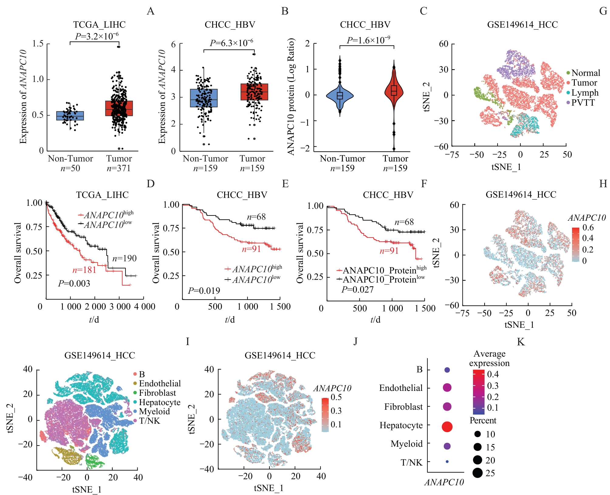 图1 ANAPC10 在HCC中的表达及与生存预后的关系Note: A/B. Comparison of ANAPC10 mRNA levels between HCC tumor tissues (tumor) and adjacent non-tumor tissues (non-tumor) in the TCGA_LIHC (A) and CHCC_HBV (B) datasets, analyzed by Student's t test. C. Comparison of ANAPC10 protein expression levels between HCC tumor tissues (Tumor) and adjacent non-tumor tissues (Non-Tumor) in the CHCC_HBV dataset, analyzed using Student's t-test. D/E. Kaplan-Meier survival analysis of overall survival (OS) stratified by high versus low ANAPC10 mRNA expression levels in the TCGA_LIHC (D) and CHCC_HBV (E) cohorts. F. Kaplan-Meier survival analysis of OS based on high versus low ANAPC10 protein expression levels in the CHCC_HBV cohort. G. t-SNE clustering plot of hepatocytes from different tissue sources (Normal, Tumor, Lymph, and PVTT) in the GEO single-cell RNA-seq dataset GSE149614. H. t-SNE clustering map displaying ANAPC10 expression levels in hepatocytes from HCC samples in the GSE149614 single-cell dataset. I. t-SNE clustering of different cell types (B cells, Endothelial cells, Fibroblasts, Hepatocytes, Myeloid cells, and T/NK cells) in HCC samples from the GSE149614 single-cell dataset. J. t-SNE clustering visualization of ANAPC10 expression across all cell populations in HCC samples from the GSE149614 dataset. K.Bubble chart illustrating ANAPC10 expression levels categorized by cell type (B cells, Endothelial cells, Fibroblasts, Hepatocytes, Myeloid cells, and T/NK cells) in the GSE149614 dataset.