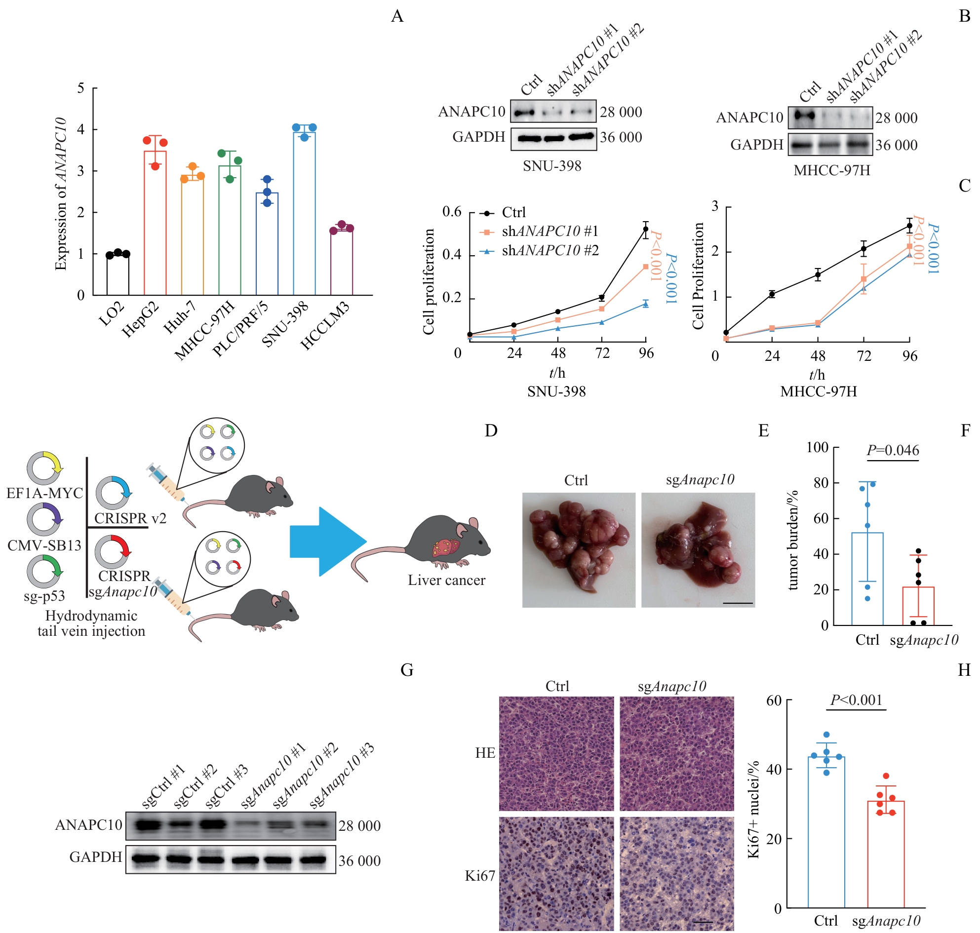 图2 ANAPC10 敲减肿瘤细胞的增殖情况及 Anapc10 敲除小鼠HCC的形成情况Note: A. qPCR was used to analyze the mRNA expression levels of ANAPC10 in various hepatocellular carcinoma cell lines (HepG2, Huh7, MHCC-97H, PLC/PRF/5, SNU-398, HCCLM3) relative to the normal hepatocyte cell line LO2. B. WB was employed to validate the protein levels of ANAPC10 after stable knockdown using shRNA in SNU-398 and MHCC-97H cell lines. C. A CCK-8 proliferation assay [with (n=6) replicates] was carried out in SNU-398 and MHCC-97H cell lines after stable ANAPC10 knockdown. Absorbance was measured at 450 nm (λ=450). D. An immunocompetent C57BL/6 mouse orthotopic HCC model was established by hydrodynamic tail-vein injection of plasmid solutions (2 mL in saline). The control group received a combination of 12 μg pT3-c-myc, 10 μg pX330-p53, 6.5 μg CMV-SB13, and 12 μg lentiCRISPR-v2. The knockout group received 12 μg pT3-c-myc, 10 μg pX330-p53, 6.5 μg CMV-SB13, and 12 μg sgAnapc10. E. Representative macroscopic images of livers with orthotopic HCC tumors were taken 34 d post-injection (n=6 per group, Ctrl vs sgAnapc10). Scale bar=10 mm. F. Hepatic tumor burden was quantified (n=6 per group, sgCtrl vs sgAnapc10). Tumor burden was calculated as the mean of (tumor area / liver area×100%). Statistical analysis was performed using Student's t-test. G. WB was used to validate the knockout efficiency of Anapc10 in tumor tissues (n=3 per group, sgCtrl vs sgAnapc10). Proteins were extracted from samples pulverized in liquid nitrogen. H. Representative H-E and Ki67 immunohistochemical staining of tumor tissues were conducted (scale bar=50 μm). Quantitative analysis of Ki67-positive cells was carried out (n=6 per group, Ctrl vs sgAnapc10). Statistical analysis was performed using Student's t-test.