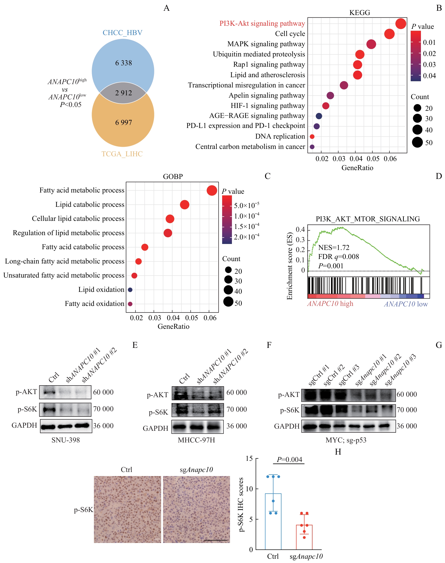 图3 ANAPC10 表达相关的通路富集分析及稳转细胞系和小鼠肝癌组织的WB和IHC验证Note:A. Patients from the TCGA_LIHC and CHCC_HBV cohorts were divided into ANAPC10-high-expression and ANAPC10-low-expression groups according to their mRNA levels. In the TCGA_LIHC cohort, there were 181 patients in the ANAPC10-high group and 190 in the ANAPC10-low group. In the CHCC_HBV cohort, there were 91 patients in the ANAPC10-high group and 68 in the ANAPC10-low group. Differentially expressed genes (DEGs) between the high- and low-expression groups (ranked by P value) were identified in both datasets, and 2 912 overlapping DEGs were found across the cohorts. B/C. KEGG (B) pathway and Gene Ontology Biological Process (GOBP) (C) enrichment analyses were carried out on the 2 912 common DEGs. D. Gene Set Enrichment Analysis (GSEA, version 4.3.2) was performed on CHCC_HBV patients stratified by ANAPC10 expression (91 patients in the ANAPC10-high group and 68 in the ANAPC10-low group). E/F. Protein expression levels of p-AKT and p-S6K in ANAPC10-knockdown SNU-398 (E) and MHCC-97H (F) cell lines were determined. G. Protein expression levels of p-Akt and p-S6k in the tumor tissues of the Anapc10-knockout orthotopic mouse hepatocellular carcinoma model were measured. H. Immunohistochemical (IHC) staining of p-S6k protein was conducted in the tumor tissues of the orthotopic hepatocellular carcinoma mouse model, along with relative IHC scoring statistics (n=6). Scale bar=100 µm. Statistical analysis was performed using the t-test.