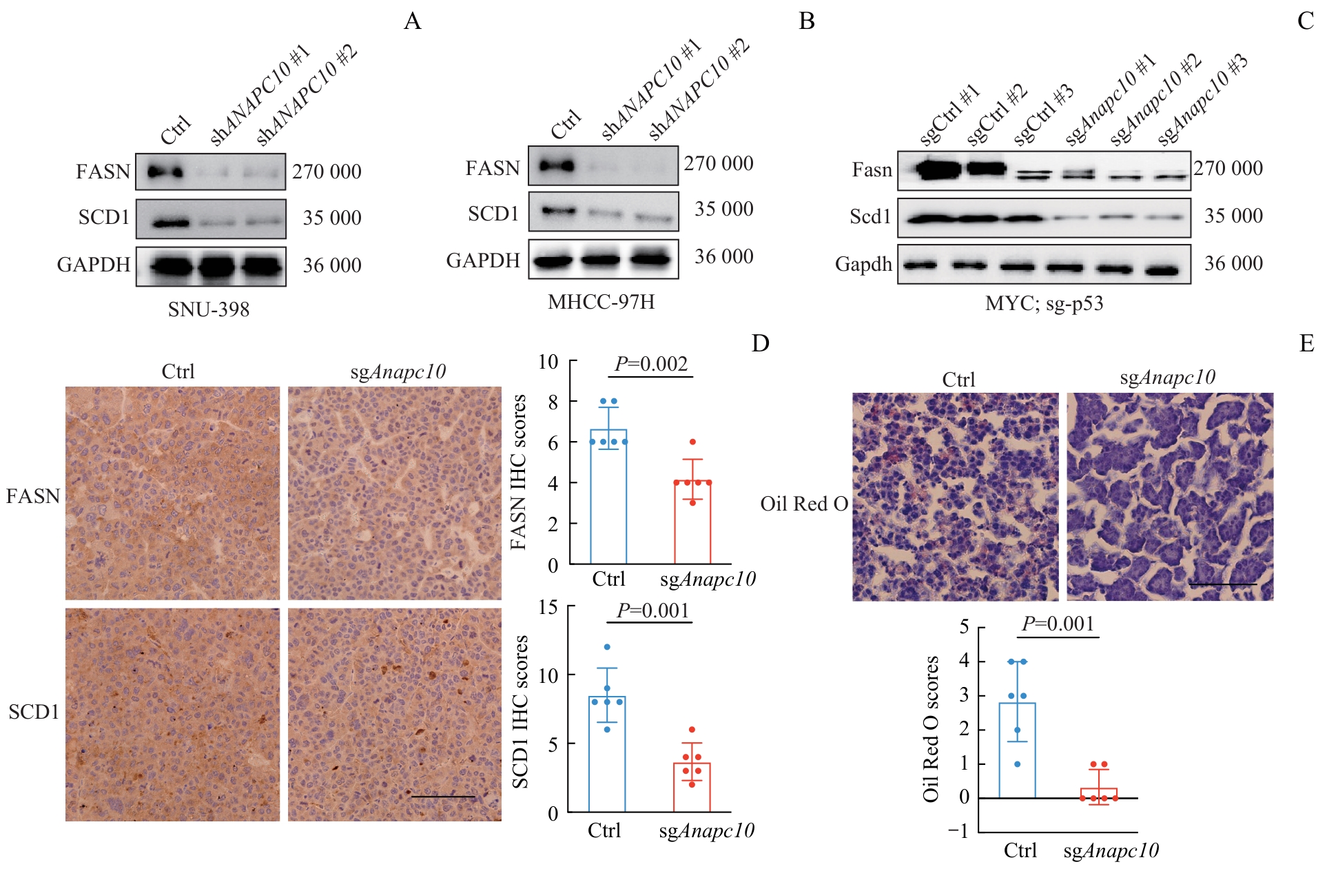 图4 稳转细胞系和小鼠肝癌组织中脂代谢关键蛋白的WB和IHC验证Note: A/B. Validation of changes in the protein expression of FASN and SCD1 in ANAPC10-knockdown stable cell lines (SNU-398 and MHCC-97H). C. Verification of the protein levels of Fasn and Scd1 in Anapc10-knockout orthotopic mouse HCC tumors. D. IHC staining of Fasn and Scd1 proteins in orthotopic HCC tumor tissues from mouse models, along with the corresponding quantitative IHC scores (n=6 biological replicates per group). E. Oil Red O staining of lipid droplets in the orthotopic HCC tumor tissues, accompanied by quantitative analysis of lipid accumulation (n=6 biological replicates per group). Scale bar=100 μm. Statistical analysis was carried out using the t-test.