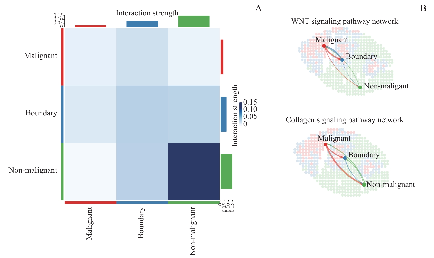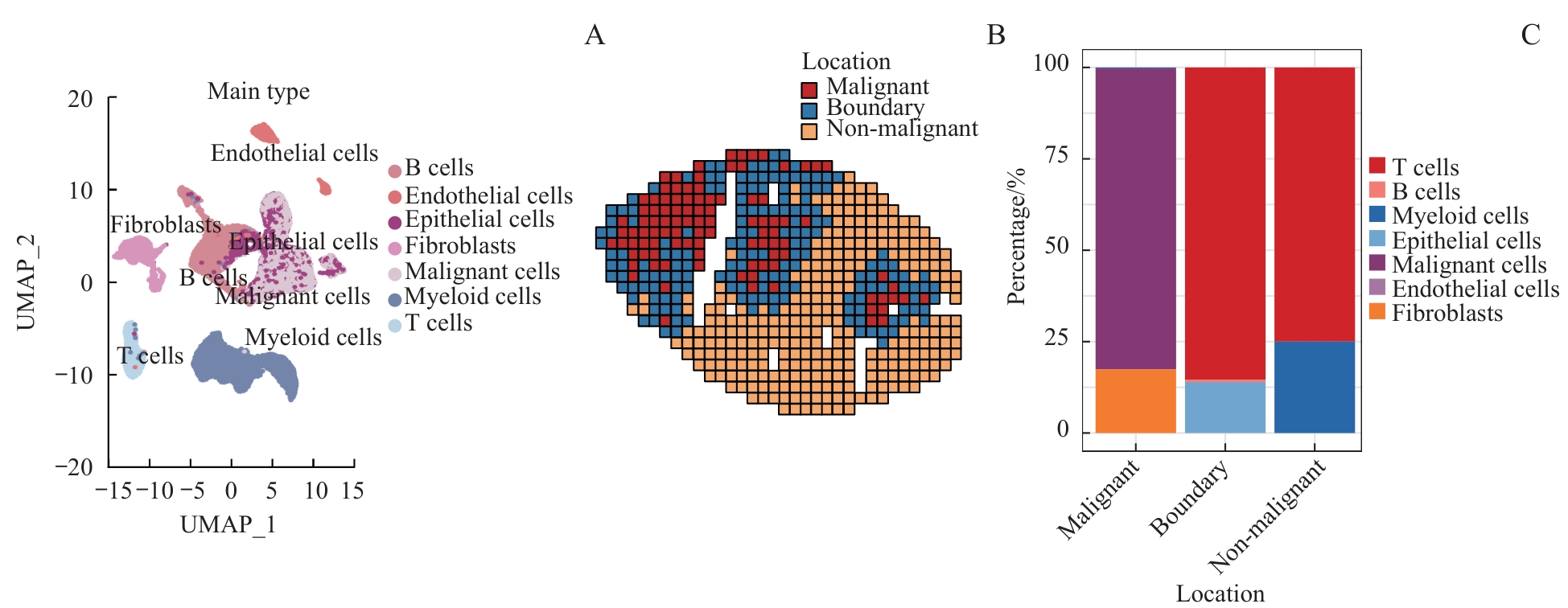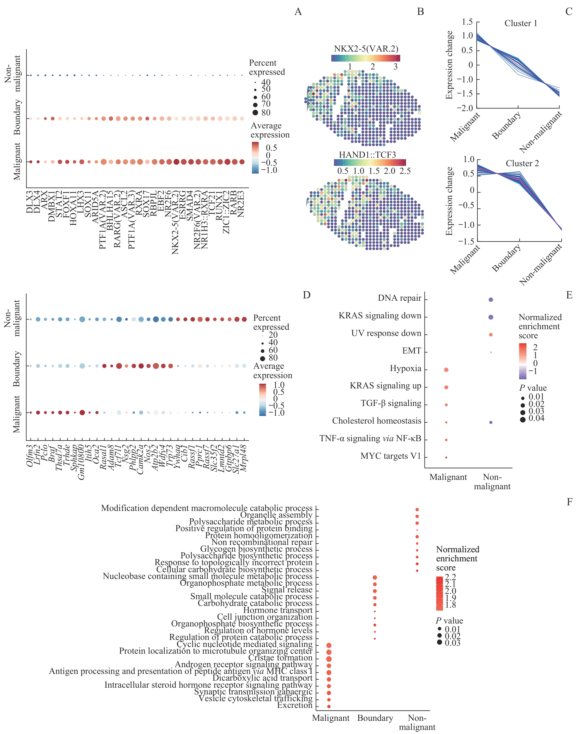 目的·研究Apcmin/+小鼠自发结肠肿瘤的空间表观遗传特征。方法·使用8月龄雄性Apcmin/+小鼠自发结肠肿瘤模型,搭建空间染色质可及性测序(assay for transposase-accessible chromatin with high-throughput sequencing,ATAC-seq)技术平台。摘取一颗小鼠结肠肿瘤,经冷冻包埋后,进行连续切片;一张组织切片使用苏木精-伊红染色观察其组织学特征,另一张相邻的组织切片进行空间ATAC-seq技术处理,得到带有空间位置信息的DNA文库后进行测序,得到该小鼠结肠肿瘤的空间染色质可及性数据。取同一只小鼠的另一颗肿瘤组织,经消化后得到细胞悬液,通过流式细胞术分选有活性的单细胞悬液,进行单细胞转录组测序,与空间染色质可及性数据联合分析此小鼠的结肠肿瘤微环境表观遗传学特征。结果·成功搭建稳定的空间ATAC-seq技术体系,并据此将小鼠的肿瘤分为恶性区域、非恶性区域以及恶性-非恶性边界区域;恶性区域富集到的转录因子包括NK2同源框转录因子5(NK2 homeobox 5,NKX2-5)、转录因子3(transcription factor 3,TCF3)等。在3个区域分别对转录因子进行富集,得到2种不同的表达趋势:一种为表达水平自恶性‒边界‒非恶性区域逐步降低;另一种为在恶性和边界区域表达水平高,在非恶性区域表达水平低。对不同区域的基因分析显示恶性区域的缺氧反应明显上调,转化生长因子(transforming growth factor,TGF)、Kirsten大鼠肉瘤病毒癌基因同源物(Kirsten rat sarcoma viral oncogene homolog,KRAS)信号通路显著上调,与细胞周期相关的功能明显增强。对肿瘤微环境中细胞间的相互作用分析发现不同区域的细胞互作强度具有显著差别,非恶性区域内部细胞的相互作用强,边界区与非恶性区以及恶性与非恶性区域的相互作用中等,恶性区与边界区的相互作用弱。结论·Apcmin/+小鼠结肠肿瘤呈高度空间异质性;肿瘤恶性区域富集了Tcf3等多种转录因子,恶性区域与边界、非恶性区域之间细胞相互作用相对较弱。