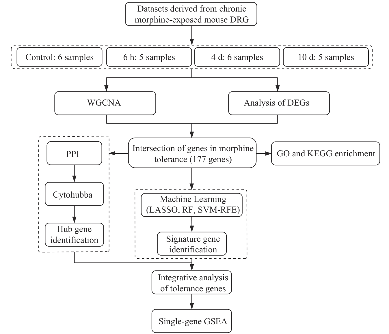 Key words: morphine tolerance, dorsal root ganglia (DRG), RNA sequencing, weighted gene co-expression network analysis (WGCNA), differentially expressed gene (DEG), machine learning
