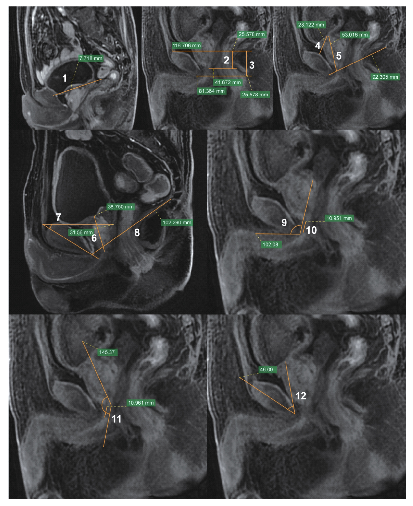 图1 MRI正中矢状图像Note: 1. IPPL; 2. Prostate apical depth; 3. Pubic height; 4. Distance from pubic symphysis to bladder neck; 5. Distance between the bladder neck and the pubococcygeous line; 6. Maximum prostate height; 7. Anteroposterior diameter of the middle pelvic plane; 8. Pubic symphysis angle; 9. Membranous urethra angle; 10. MUL; 11. Angle between the membranous urethra and the prostatic axis; 12. Pubourethral angle.