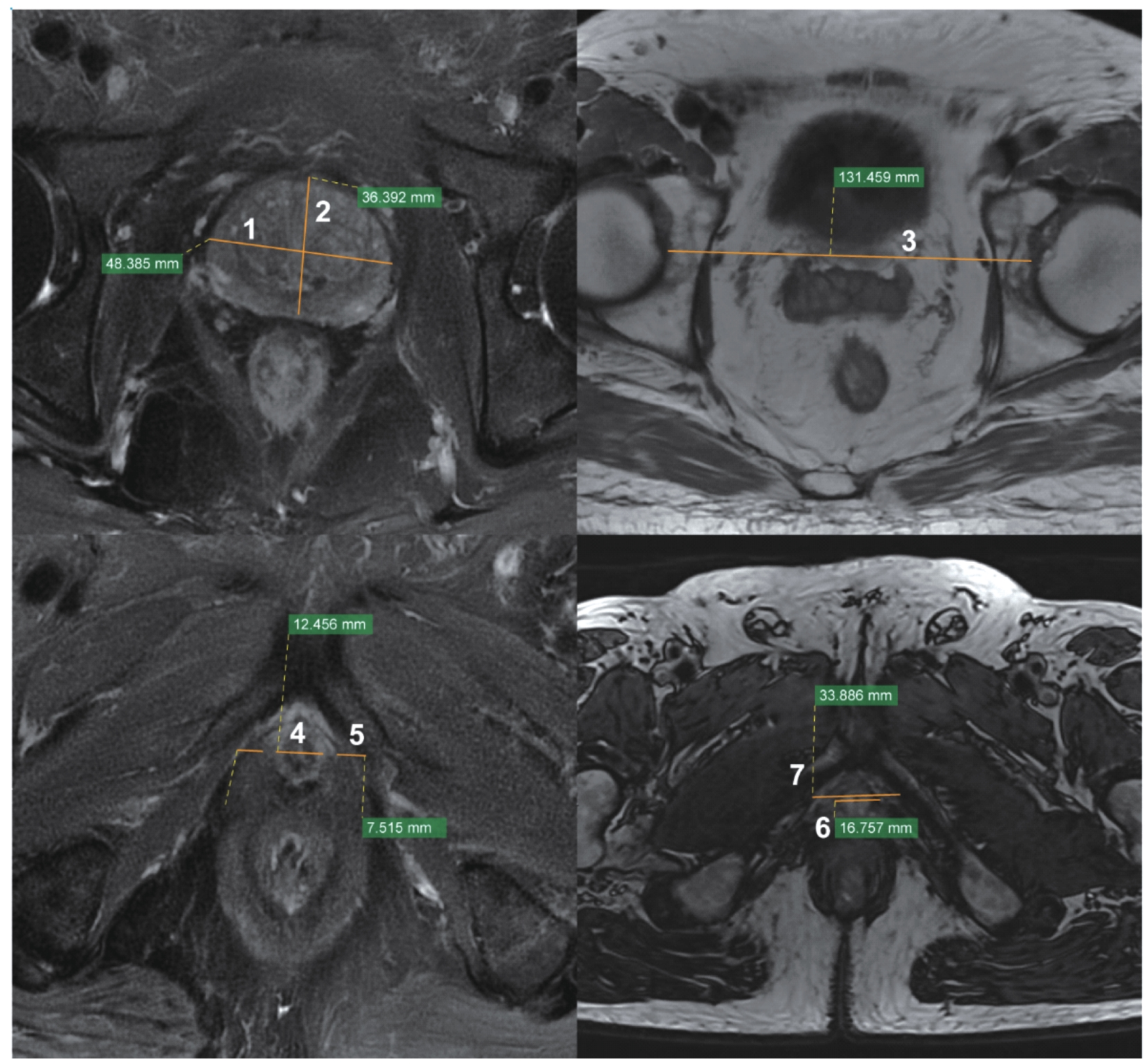 图2 MRI轴向图像Note: 1. Maximum prostate width; 2. Maximum prostate length; 3. Femoral bone width; 4. Urethral wall thickness; 5. Levator ani muscle thickness; 6. Average thickness of the levator ani muscle; 7. Lateral distance of the levator ani muscle.