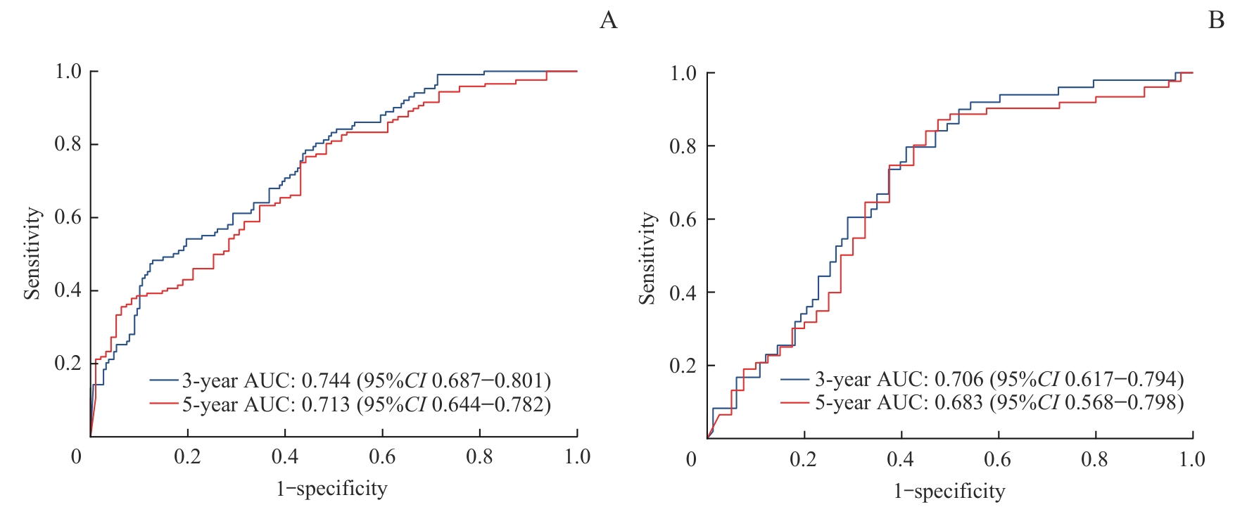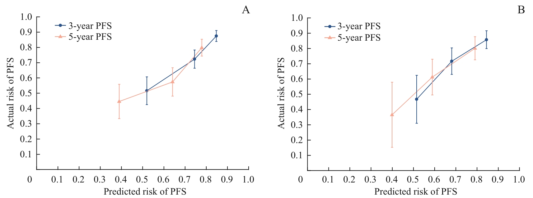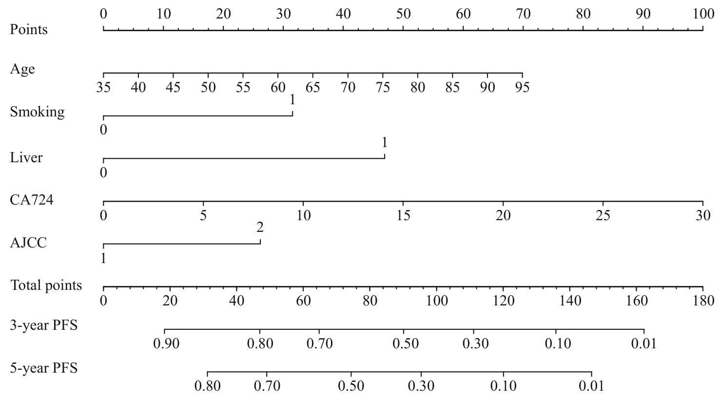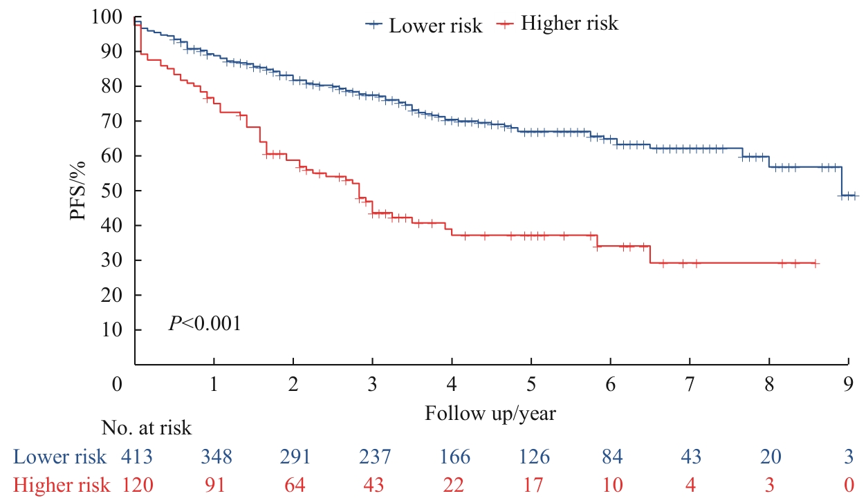 目的·探究影响结直肠癌(colorectal cancer,CRC)患者无进展生存时间(progression-free survival,PFS)的风险因素,建立相应的预后预测模型。方法·采用回顾性队列研究,纳入上海交通大学医学院附属同仁医院的533例经手术切除并病理确诊为结直肠腺癌的患者,按照7∶3的比例随机拆分为训练集(373例)和验证集(160例)。采用单因素和多因素Cox比例风险回归模型分析纳入的临床资料,分析CRC患者术后PFS的独立影响因素,并建立关于结直肠癌的临床预后预测模型。使用一致性指数(concordance index,C-index)、受试者操作特征曲线(receiver operator characteristic curve,ROC曲线)下面积(area under the curve,AUC)、校准曲线、生存曲线评估预测模型的区分度和校准度。进一步通过多因素Cox回归分析确定不同年龄、性别以及美国癌症联合委员会(American Joint Committee on Cancer,AJCC)癌症分期人群预后的独立影响因素。结果·多因素Cox回归分析发现,年龄、吸烟史、肝脏疾病、糖类抗原724(carbohydrate antigen 724,CA724)、AJCC分期是PFS的独立影响因素。在训练集中,该PFS模型的C-index为0.69,3年和5年的AUC分别为0.744和0.713。在验证集中,该PFS模型的C-index为0.64,3年和5年的AUC分别为0.706和0.683。校准曲线图可见训练集和验证集的PFS预测校准曲线均趋近标准曲线。生存曲线提示低风险组患者的进展率显著低于高风险组。分层分析结果表明:对年龄≥65岁患者,年龄、肝脏疾病、AJCC临床分期是术后PFS的独立影响因素;对年龄<65岁的患者,吸烟史、CA724、AJCC临床分期是术后PFS的独立影响因素。对男性患者,年龄、吸烟史、CA724、AJCC临床分期是术后PFS的独立影响因素;对女性患者,肝脏疾病、CA724、AJCC临床分期是术后PFS的独立影响因素。对AJCC分期Ⅰ~Ⅱ期的患者,年龄和吸烟史是术后PFS的独立影响因素;对AJCC分期Ⅲ~Ⅳ期的患者,年龄、肝脏疾病和CA724是术后PFS的独立影响因素。结论·针对CRC患者建立的PFS预后模型具有较好区分能力,为临床医师提供了有效的风险评估工具。