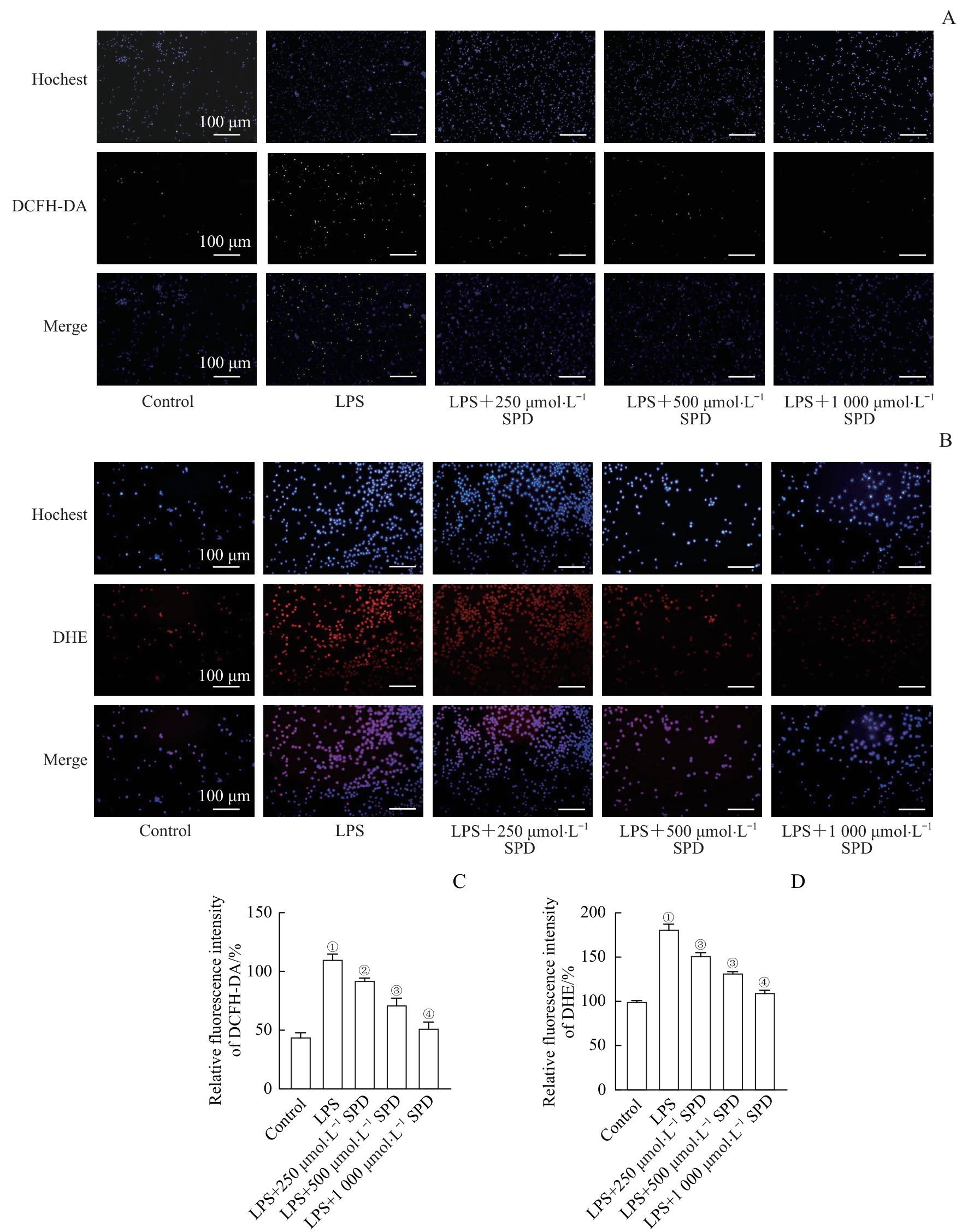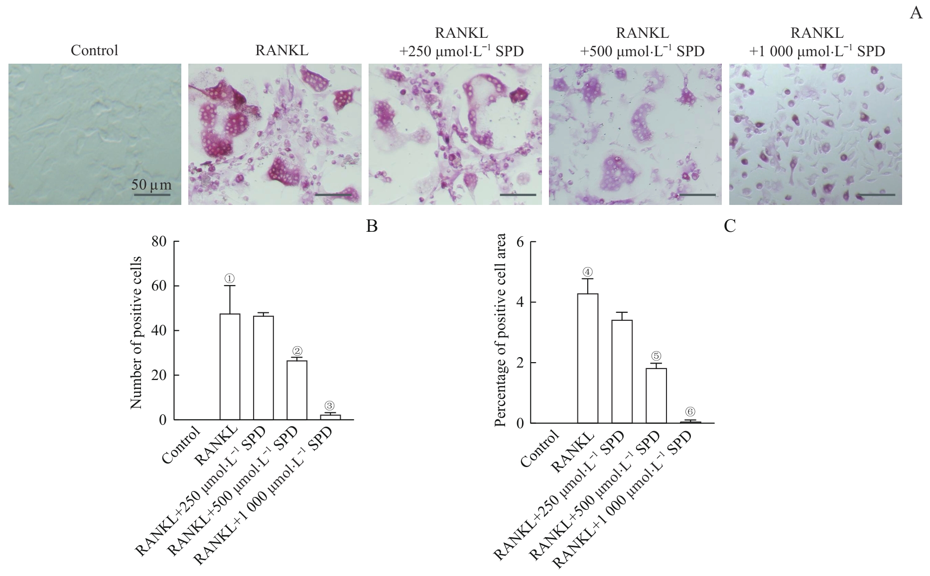 Objective ·To investigate the inhibitory effects of spermidine (SPD) on inflammatory osteolysis both in vivo and in vitro. Methods ·The CCK-8 assay was used to assess the viability of RAW264.7 macrophages treated with various concentrations of SPD. The levels of intracellular reactive oxygen species (ROS) in lipopolysaccharide (LPS)-activated RAW264.7 cells were evaluated by staining with dichlorodihydrofluorescein diacetate (DCFH-DA) and dihydroethidium (DHE), respectively. Reverse transcription real-time fluorescence quantitative PCR (RT-qPCR) was utilized to determine the effects of SPD on the expression of pro-inflammatory genes in LPS-activated RAW264.7 cells. Tartrate-resistant acid phosphatase (TRAP) staining was used to evaluate the effect of SPD on the differentiation of mouse primary bone marrow-derived macrophages (BMMs) into osteoclasts. RT-qPCR was employed to further analyze the effect of SPD on the expression of genes related to osteoclast differentiation and functions after BMM-induced differentiation. An LPS-induced mouse calvarial osteolysis model was constructed, and the therapeutic efficacy of SPD on inflammatory osteolysis was assessed using Micro-CT analysis, hematoxylin-eosin (H-E) staining and TRAP staining of histological sections. Results ·The CCK-8 assay showed that SPD, even at a concentration of 1 000 μmol/L, exhibited no significant cytotoxicity to RAW264.7 cells. ROS analysis revealed that SPD markedly inhibited LPS-induced elevation of intracellular ROS levels in macrophages. RT-qPCR results indicated that SPD suppressed the expression of pro-inflammatory genes induced by LPS. Both TRAP staining and RT-qPCR demonstrated that SPD effectively inhibited the differentiation of BMMs into osteoclasts induced by receptor activator of nuclear factor-κB ligand (RANKL) and reduced the expression of genes associated with osteoclast differentiation and function. In the mouse calvarial osteolysis model, Micro-CT analysis showed that the bone volume fraction and bone mineral density in the SPD-treated groups were significantly higher than those in the LPS group. Histological staining revealed that SPD treatment reduced inflammatory cell infiltration, decreased osteoclast numbers, and alleviated tissue damage. Conclusion ·SPD inhibits macrophage inflammatory responses and RANKL-induced osteoclast differentiation in vitro; in vivo, it alleviates LPS-induced inflammatory calvarial osteolysis in mice.
