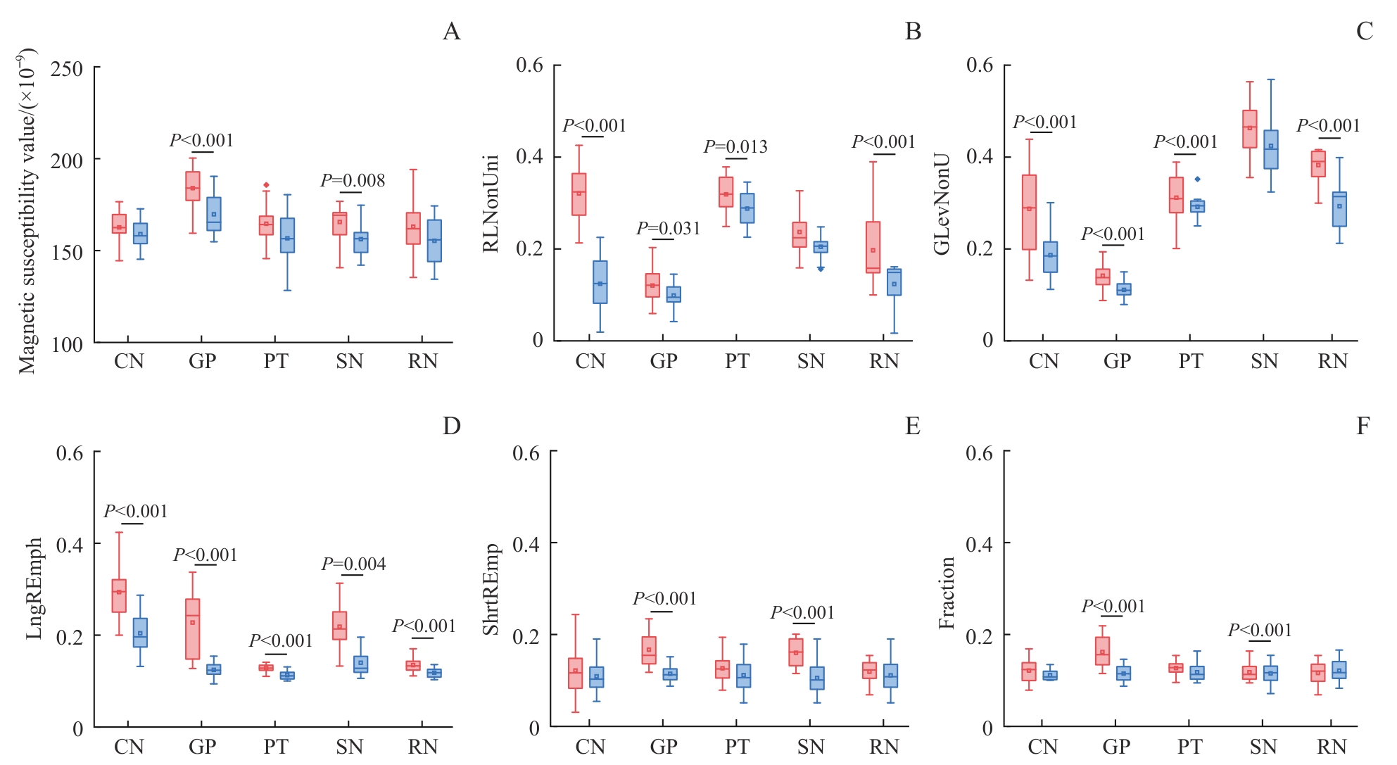 图2 磁化率的平均值和纹理参数的相对 D值的比较Note: A. Mean values of magnetic susceptibility. B. RLNonUni. C. GLevNonU. D. LngREmph. E. ShrtREmp. F. Fraction. Red is the PD group, and blue is the HC group.