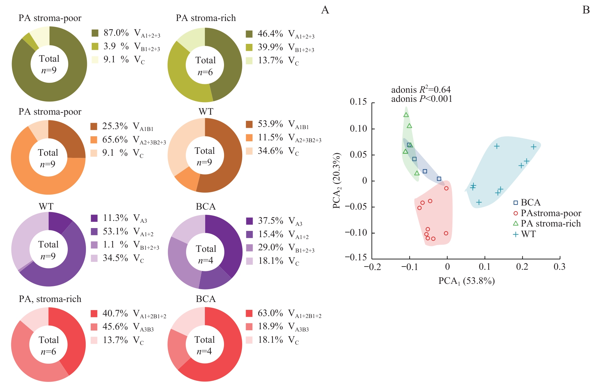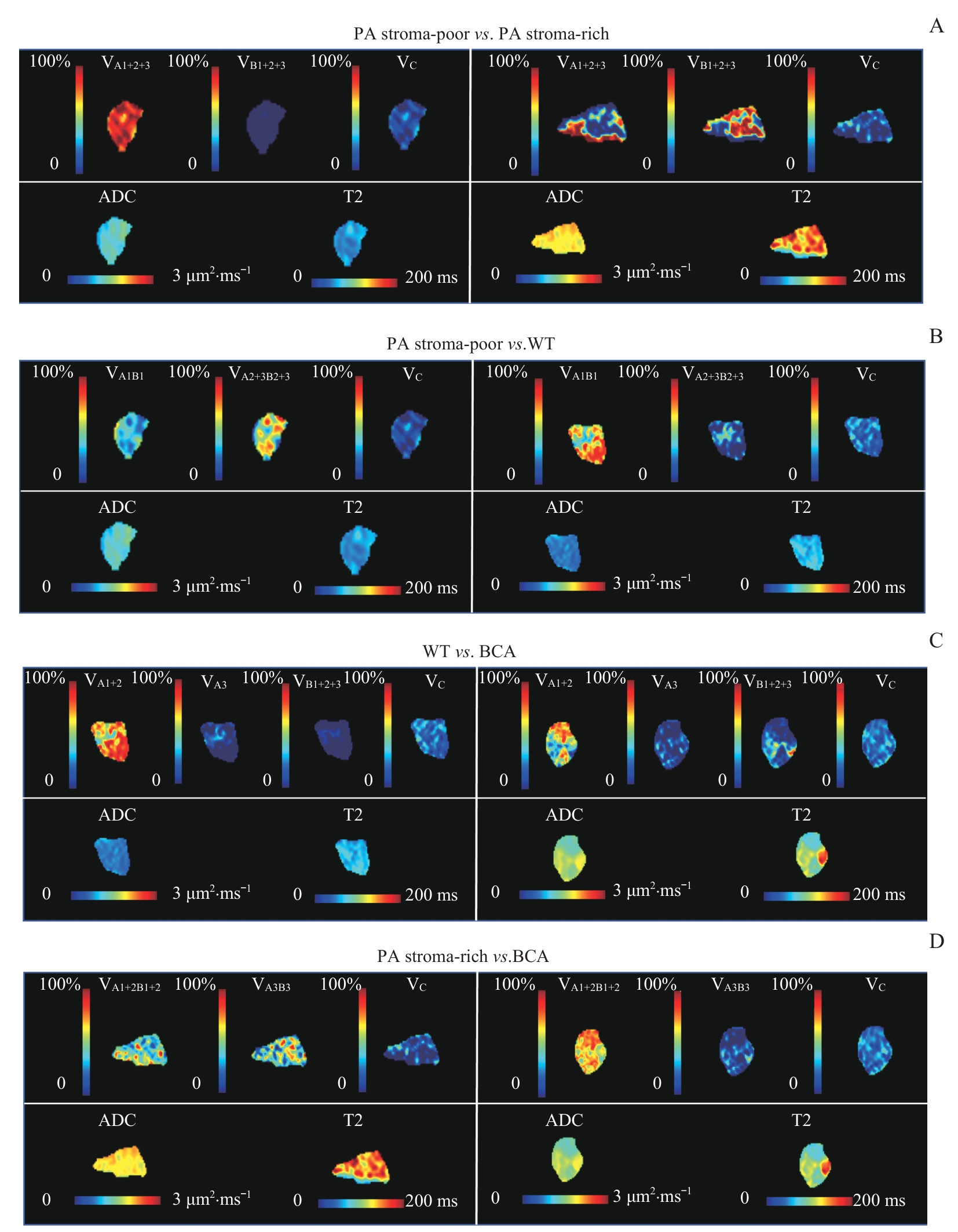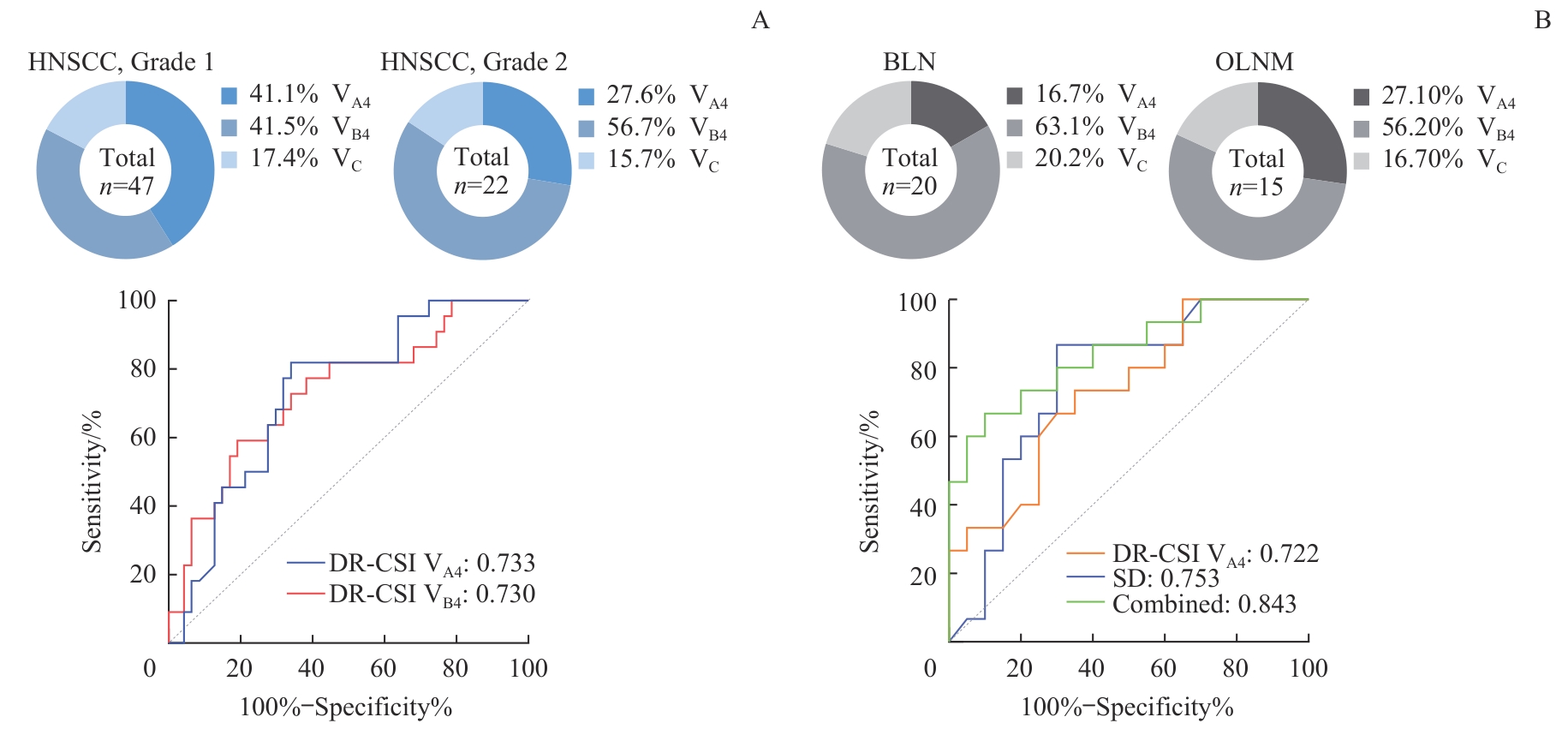 目的·评估磁共振弥散-弛豫耦合谱成像(diffusion-relaxation correlation spectroscopic imaging,DR-CSI)识别头颈部良恶性肿瘤异质性及隐匿性淋巴结转移(occult lymph node metastasis,OLNM)的可行性并检验其诊断效能。方法·前瞻性纳入2024年1月—12月上海交通大学医学院附属第九人民医院收治的疑似头颈部肿瘤、拟行手术且有明确病理诊断的患者。所有患者术前行常规头颈部平扫加增强磁共振成像(magnetic resonance imaging,MRI),含DR-CSI序列。常规图像上获得肿瘤最大径(maximal diameter,MD)、浸润深度(depth of invasion,DOI)及淋巴结长短径等数据,DR-CSI经后处理得到表观扩散系数(apparent diffusion coefficient,ADC)、T2值及所有病灶的D-T2耦合谱。基于不同疾病的谱峰分布特征进行亚区优化分割,分割后获得各亚区的体积分数V i。使用独立样本t检验、Mann-Whitney U检验、χ2检验或Fisher精确检验比较患者临床资料和影像学参数的组间差异。使用主成分分析(principle component analysis,PCA)及Adonis分析评估影像学参数区分头颈部良性肿瘤不同亚型的效能。通过受试者操作特征(receiver operating characteristic,ROC)曲线评价单变量或多变量区分头颈鳞状细胞癌(head and neck squamous cell carcinoma,HNSCC)恶性程度并识别OLNM的能力。结果·共收集头颈部肿瘤97例,其中良性28例,HNSCC 69例。另有15枚经病理证实的OLNM及20枚良性淋巴结(benign lymph node,BLN)。28例良性肿瘤中,多形性腺瘤-基质丰富型(pleomorphic adenoma stroma-rich,PA stroma-rich)6例,基质缺乏型(pleomorphic adenoma stroma-rich,PA stroma-poor)9例,腺淋巴瘤(Warthin’s tumor,WT)9例,基底细胞腺瘤(basal cell adenoma,BCA)4例。良性肿瘤各亚型部分影像学参数(ADC、T2及DR-CSI V i )的组间差异均具有统计学意义(均P<0.05)。PCA结果表明,含DR-CSI的影像学参数在头颈部良性肿瘤不同病理亚型间具有良好的区分度(R2=0.64,P<0.001)。69例HNSCC中,Grade 1组(高/高—中分化)47例,Grade 2组(中/中—低/低分化)22例。相较于恶性程度较低的Grade 1组,Grade 2组ADC更低,T2值更大,但差异均未达统计学意义。随着HNSCC的恶性程度增加,VA4明显减少,而VB4明显增大,组间差异具有统计学意义。相较于BLN,OLNM的短径(short diameter,SD)和VA4显著增加,联合SD和VA4对术前识别OLNM的诊断效能达0.843。结论·DR-CSI可通过解耦合获得单个体素独立的弥散和弛豫特征并解析肿瘤微观成分,在表征头颈部良性肿瘤不同亚型、HNSCC恶性程度和识别OLNM中具有良好的诊断价值。相较于传统单维参数ADC或T2等,DR-CSI能在亚体素水平更好地解析组织微观结构。