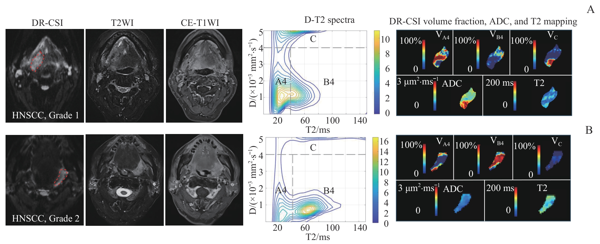 Objective ·To evaluate the feasibility and diagnostic performance of diffusion-relaxation correlation spectroscopic imaging (DR-CSI) in assessing the heterogeneity of benign and malignant head and neck tumors, as well as in identifying occult lymph node metastasis (OLNM). Methods ·A prospective study was conducted from January to December 2024 at Shanghai Ninth People's Hospital, Shanghai Jiao Tong University School of Medicine, enrolling patients with suspected head and neck tumors who were scheduled for surgery and had a confirmed pathological diagnosis. All patients underwent preoperative routine head and neck plain and contrast-enhanced magnetic resonance imaging (MRI) examinations, including DR-CSI sequence. Conventional imaging parameters, including maximal diameter (MD), depth of invasion (DOI) for tumors, and MD and short diameter (SD) for lymph nodes, were obtained. Post-processing was performed to obtain apparent diffusion coefficient (ADC), T2 value, and D-T2 spectra for all lesions. The compartment segmentation strategy was optimized based on the spectral peak distribution characteristics of different diseases, and the volume fraction (V i ) of each compartment was obtained. Independent sample t-tests, Mann-Whitney U tests, chi-square tests, or Fisher's exact tests were used to compare intergroup differences in clinical data and imaging metrics. Principal component analysis (PCA) and Adonis analysis were employed to evaluate the discriminative ability of imaging metrics among different subtypes of benign tumors. Receiver operating characteristic (ROC) analysis was used to evaluate the ability of univariate and multivariable models to characterize the malignancy of head and neck squamous cell carcinoma (HNSCC) and identify OLNM. Results ·A total of 97 cases were collected, including 28 benign tumors and 69 HNSCCs. Fifteen pathologically confirmed OLNMs and 20 benign lymph nodes (BLNs) were also enrolled. Among the 28 benign tumors, there were 6 cases of pleomorphic adenoma stroma-rich (PA stroma-rich), 9 cases of pleomorphic adenoma stroma-poor (PA stroma-poor), 9 cases of Warthin's tumor (WT), and 4 cases of basal cell adenoma (BCA). Statistically significant differences were observed in certain imaging parameters (ADC, T2, and DR-CSI V i ) among benign tumor subtypes. PCA analysis demonstrated a strong discriminative ability of imaging parameters in distinguishing pathological subtypes of benign tumors (R²=0.64, P<0.001). Among the 69 HNSCCs, 47 were classified as Grade 1 (well/moderately well-differentiated) and 22 as Grade 2 (moderately/poorly differentiated). Compared to Grade 1, Grade 2 showed lower ADC and higher T2 values, though differences were not statistically significant. As HNSCC malignancy increased, VA4 decreased and VB4increased significantly. OLNM showed a significant increase in SD and VA4 compared to BLNs. The combination of SD and VA4 for preoperative OLNM identification achieved a diagnostic efficiency of 0.843. Conclusion ·DR-CSI can analyze diffusion and relaxation characteristics at the sub-voxel level, offering valuable insights for characterizing benign head and neck tumor subtypes, assessing HNSCC malignancy, and identifying OLNMs. Compared to traditional parameters like ADC or T2, DR-CSI provides enhanced tissue microstructure analysis.
