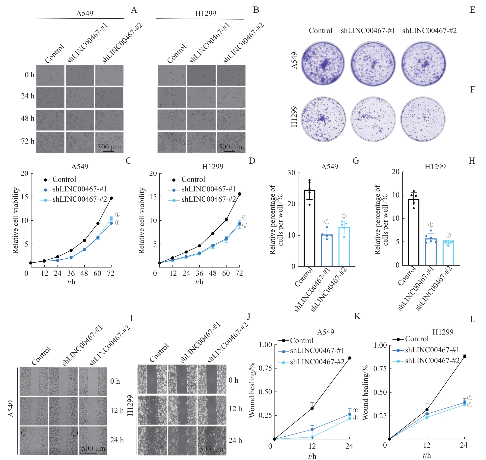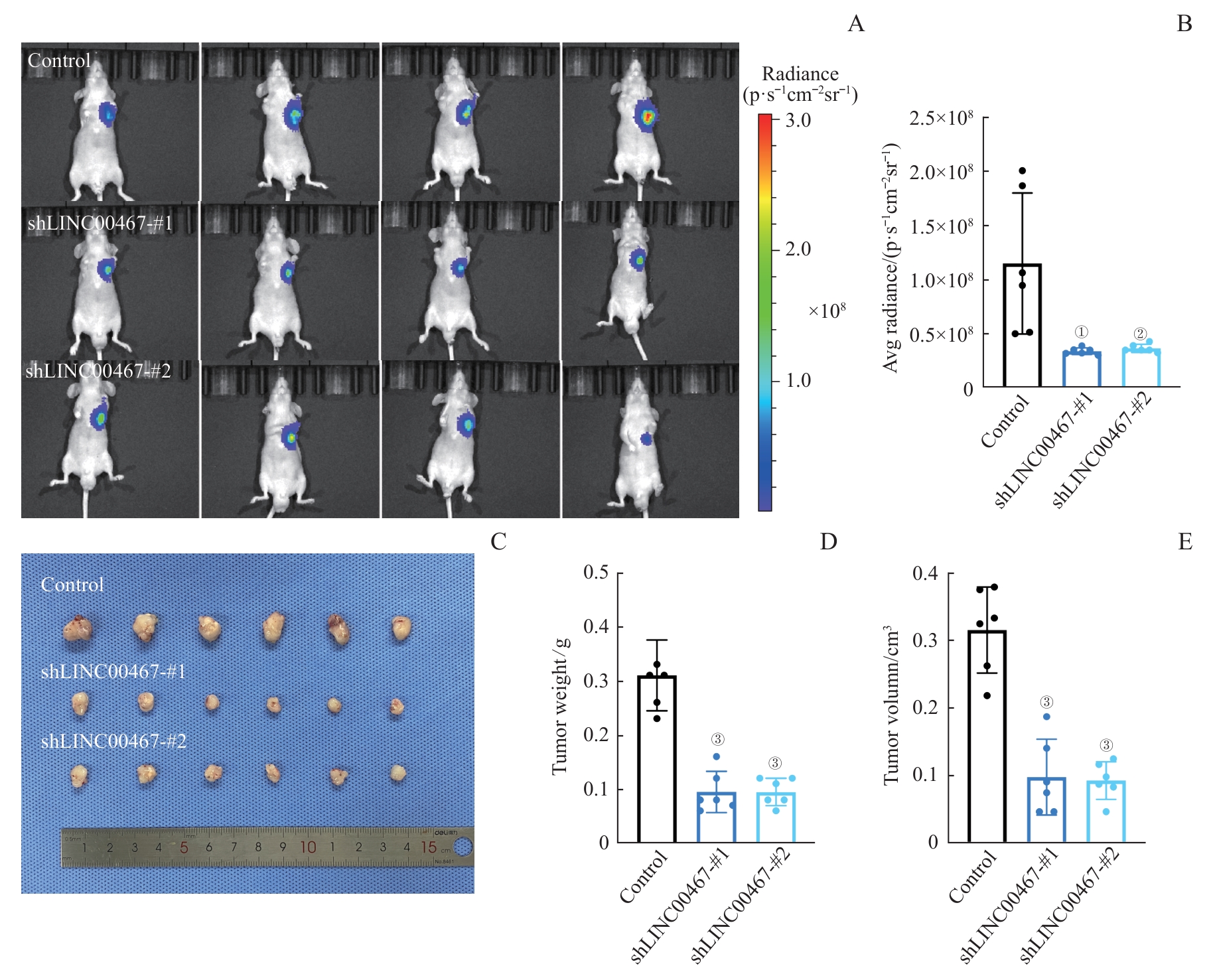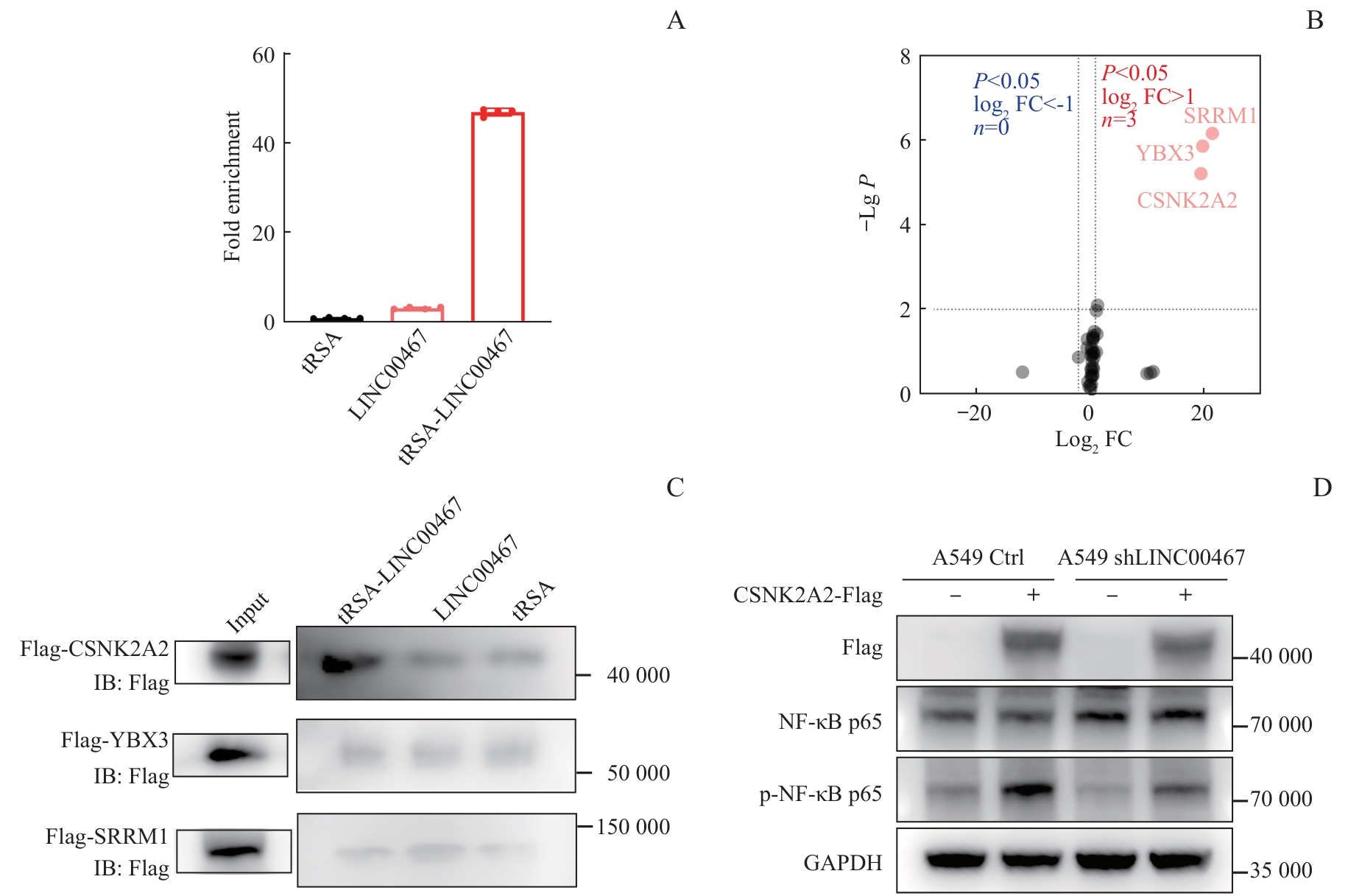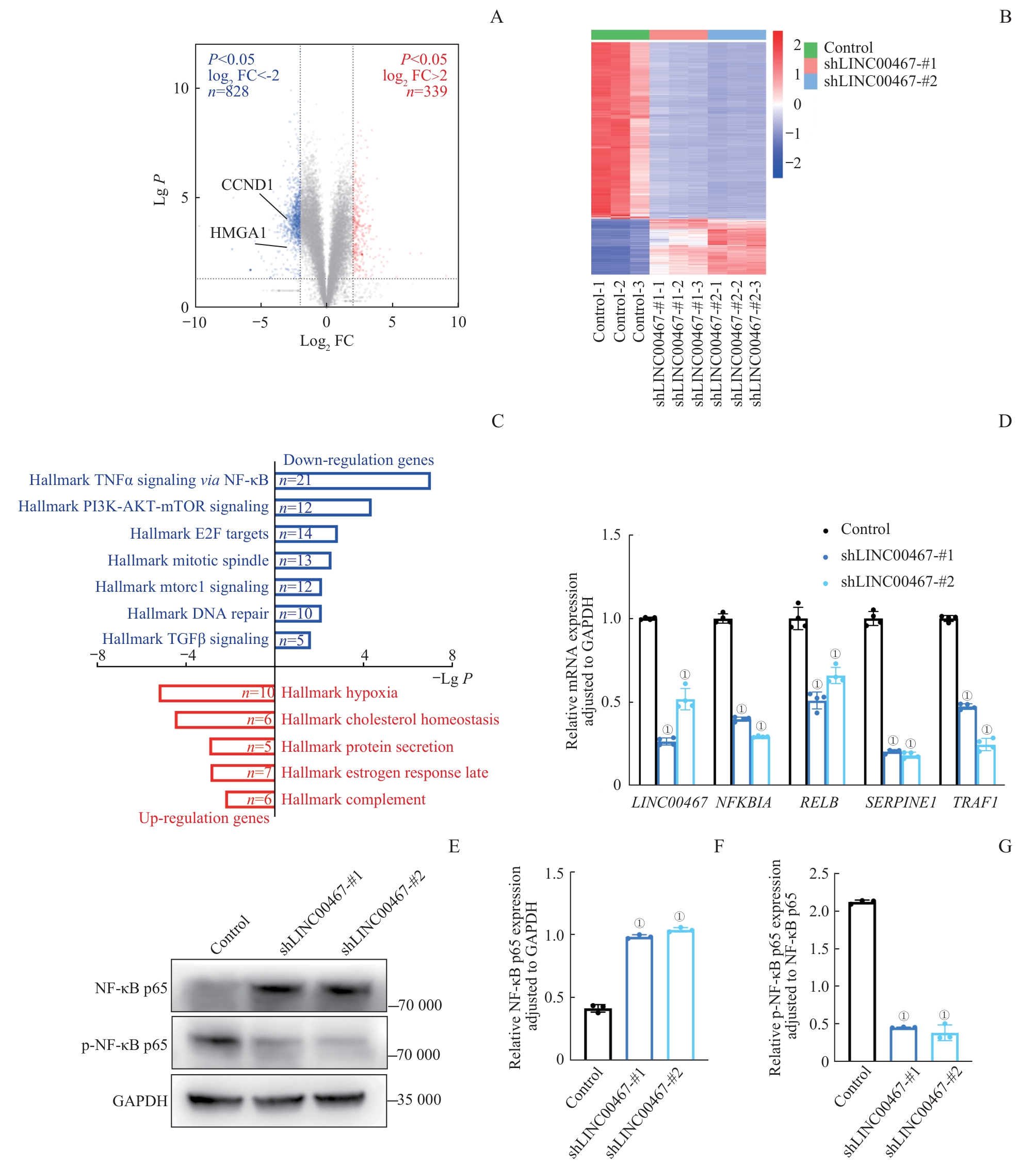 Objective ·To investigate the expression of long noncoding RNA (lncRNA) LINC00467 in lung adenocarcinoma (LUAD) and its impact on the poor prognosis of patients, as well as its functional role and underlying molecular mechanisms in the occurrence and development of LUAD. Methods ·First, tumor sample data from The Cancer Genome Atlas (TCGA) database were utilized to analyze the expression levels of LINC00467 in LUAD tissues and its correlation with patient survival. Second, a stable LINC00467-knockdown LUAD cell line was established, and the effects of LINC00467 on LUAD cell proliferation, colony formation, migration, and tumorigenicity were assessed through cell phenotypic experiments (including live-cell imaging for cell proliferation analysis, plate colony formation assays, and wound healing assays) and nude mouse tumor formation experiments. Furthermore, RNA sequencing (RNA-seq), differentially expressed genes (DEGs) analysis, and hallmark gene sets enrichment analysis were performed to identify signaling pathways regulated by LINC00467, and Western blotting was used to validate its impact on tumor cell pathways. Finally, RNA pull-down combined with mass spectrometry and co-immunoprecipitation (co-IP) assays were conducted to filter and identify LINC00467-interacting proteins. Results ·Analysis of tumor sample data from the TCGA database showed that LINC00467 was highly expressed in LUAD, and its expression level was negatively correlated with overall survival in LUAD patients (P=0.004). Cell phenotypic experiments and nude mouse tumor formation experiments demonstrated that LINC00467 knockdown significantly inhibited the proliferation, colony formation, migration and in vivo tumorigenesis of LUAD cells (all P<0.05). RNA-seq, DEGs analysis, hallmark gene sets enrichment analysis, and Western blotting indicated that knockdown of LINC00467 suppressed the activation of nuclear factor kappa-B (NF-κB) signaling pathway. RNA pull-down combined with mass spectrometry and co-IP assays demonstrated that LINC00467 interacted with casein kinase 2 alpha 2 (CSNK2A2) and promoted the phosphorylation of NF-κB p65. Conclusion ·High expression of LINC00467 in LUAD tissues is negatively correlated with patient prognosis. LINC00467 can interact with CSNK2A2, promote the phosphorylation of NF-κB p65, activate the NF-κB pathway, and enhance LUAD proliferation, colony formation, migration, and in vivo tumorigenesis.