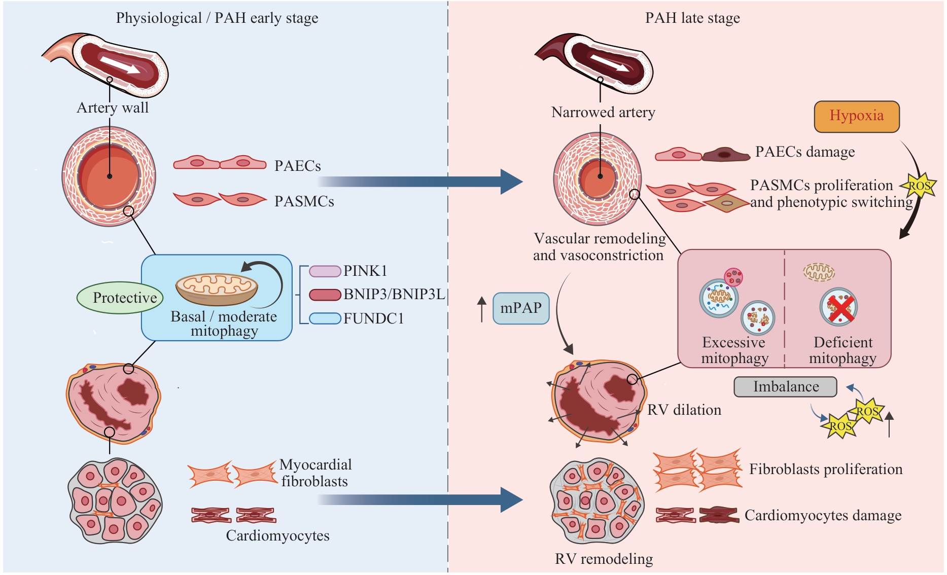 Pulmonary arterial hypertension (PAH) is a complex cardiopulmonary disease characterized by persistent constriction and remodeling of the pulmonary arterioles, leading to sustained elevation of pulmonary arterial pressure, right ventricular remodeling, and ultimately right heart failure. Although current clinical therapies mainly alleviate symptoms by targeting the imbalance between vasoconstriction and vasodilation, the overall prognosis remains poor and the mortality rate continues to rise, highlighting the urgent need for novel therapeutic strategies. Mitochondria serve as the primary energy source for cells, generating ATP through oxidative phosphorylation (OXPHOS). However, this process generates reactive oxygen species (ROS), which can damage proteins, lipids, and DNA, thereby exacerbating cellular dysfunction. As a crucial mechanism for maintaining cellular homeostasis, mitophagy facilitates the recognition and clearance of damaged mitochondria, thereby ensuring balanced cellular energy metabolism. Recent studies have revealed a dual-faceted role of mitophagy in the pathogenesis and progression of PAH. On the one hand, mitophagy may be moderately activated during the early stages of PAH to clear damaged mitochondria and suppress abnormal cell proliferation; on the other hand, with PAH progression, excessive mitophagy activation occurs alongside abnormal proliferation of various cell types, leading to pulmonary vascular and right ventricular remodeling. This paper reviews recent literature to elucidate the role of mitophagy in pulmonary vascular and right ventricular remodeling at different stages of PAH, aiming to provide a theoretical basis for developing more effective therapeutic interventions for PAH.