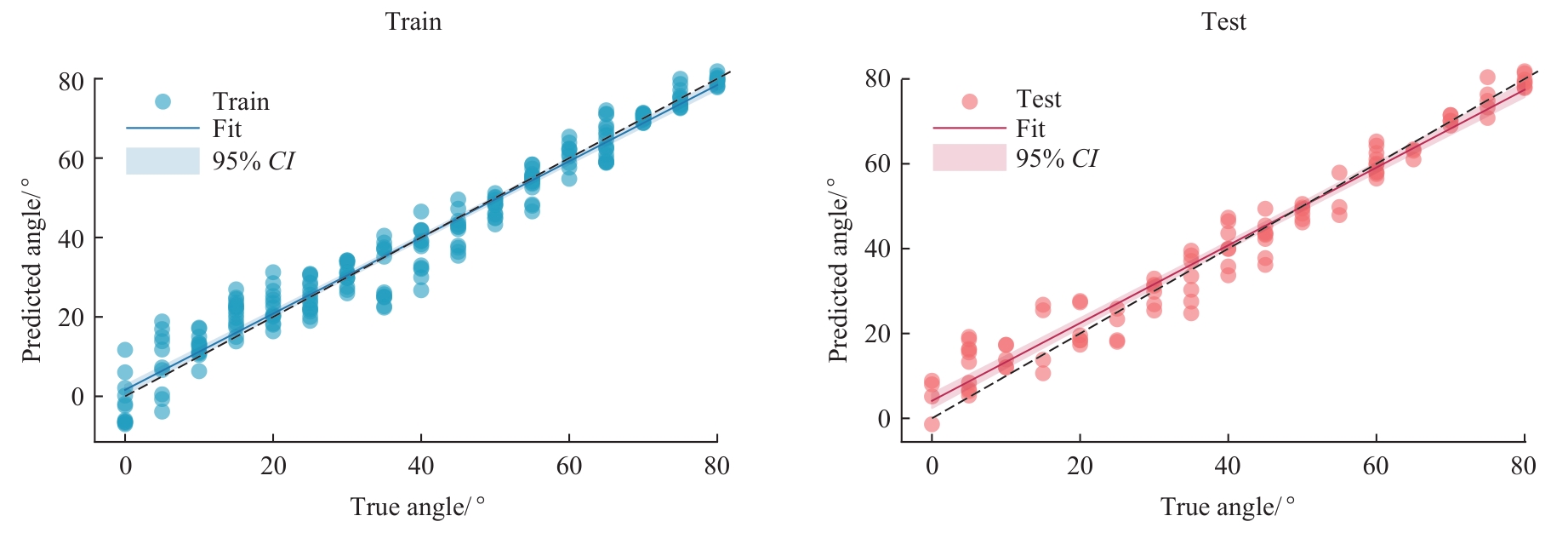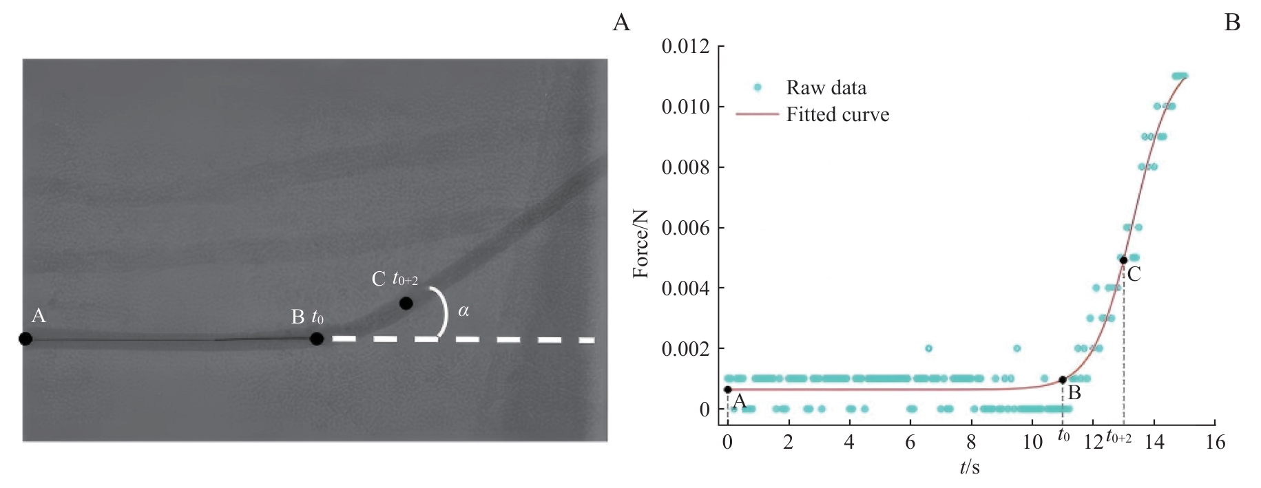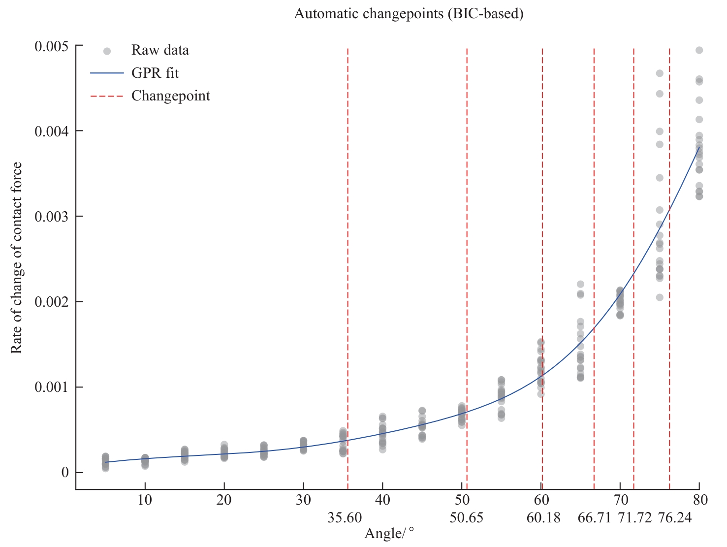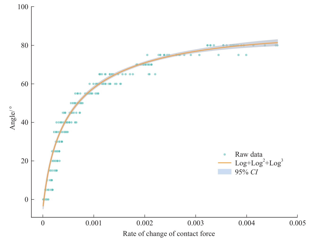 Objective ·This study addresses the challenges of multimodal perception deficiencies and X-ray radiation dependency in vascular interventional robots. It investigated the mechanical characteristics of guidewire-vessel wall contact forces across varying vascular bending angles and established a contact force-angle mapping model to develop a novel robotic-assisted strategy integrating real-time vascular angle prediction and safety warning based on mechanical parameters. Methods ·An in vitro vascular model (bending angles: 0°‒80° at 5° intervals) was deployed on the R-One robotic platform. A force-sensing guidewire was advanced at 6 mm/s through curved segments. Using temporal registration, dynamic contact force variation trends (quantified as the rate of change) were extracted during the initial 2s traversal window. The correlation between vascular bending angles and variation rates was quantified. Based on this, a mapping model between contact force trends and vascular angles was constructed and evaluated using root mean squared error (RMSE) and mean absolute error (MAE). Results ·A very strong positive correlation was observed between vascular bending angle and the rate of change in guidewire contact force during the initial phase of traversal through the bend (rs =0.98, P<0.001). This relationship exhibited distinct phases relative to the 0° baseline: the rate remained stable within the 0°‒25°, with no statistically significant differences; a significant increase first appeared at 30° (P.adj<0.05); beyond 50°, the rate of increase accelerated markedly, accompanied by a sharp enhancement in statistical significance (P.adj decreasing from 10-5 to 10-8). By 80°, the rate of change in contact force increased by 24, 392.4%. Bayesian Information Criterion (BIC)-based changepoint analysis identified critical transition points at 35.60° and 50.65°, which closely align with the empirical thresholds of 30° and 50°, further confirming the structural nature of the relationship. The contact force-angle mapping model developed based on this relationship demonstrated excellent performance (R2=0.96, RMSE=4.93°, MAE=3.73°), significantly outperforming a conventional linear model (R2=0.89, RMSE=7.66°, MAE=5.03°). Conclusion ·In the in vitro model, the rate of change of contact force during the initial phase of guidewire entry into a curved segment exhibited a significant positive correlation with vascular bending angle, characterized by distinct phase transitions and critical inflection points. Based on this feature, a contact force-angle mapping model was established, which outperformed the traditional linear model. This study preliminarily validates the feasibility of inferring vascular anatomical structures from mechanical characteristics, providing a theoretical basis for mechanics-based safety warning and auxiliary navigation.