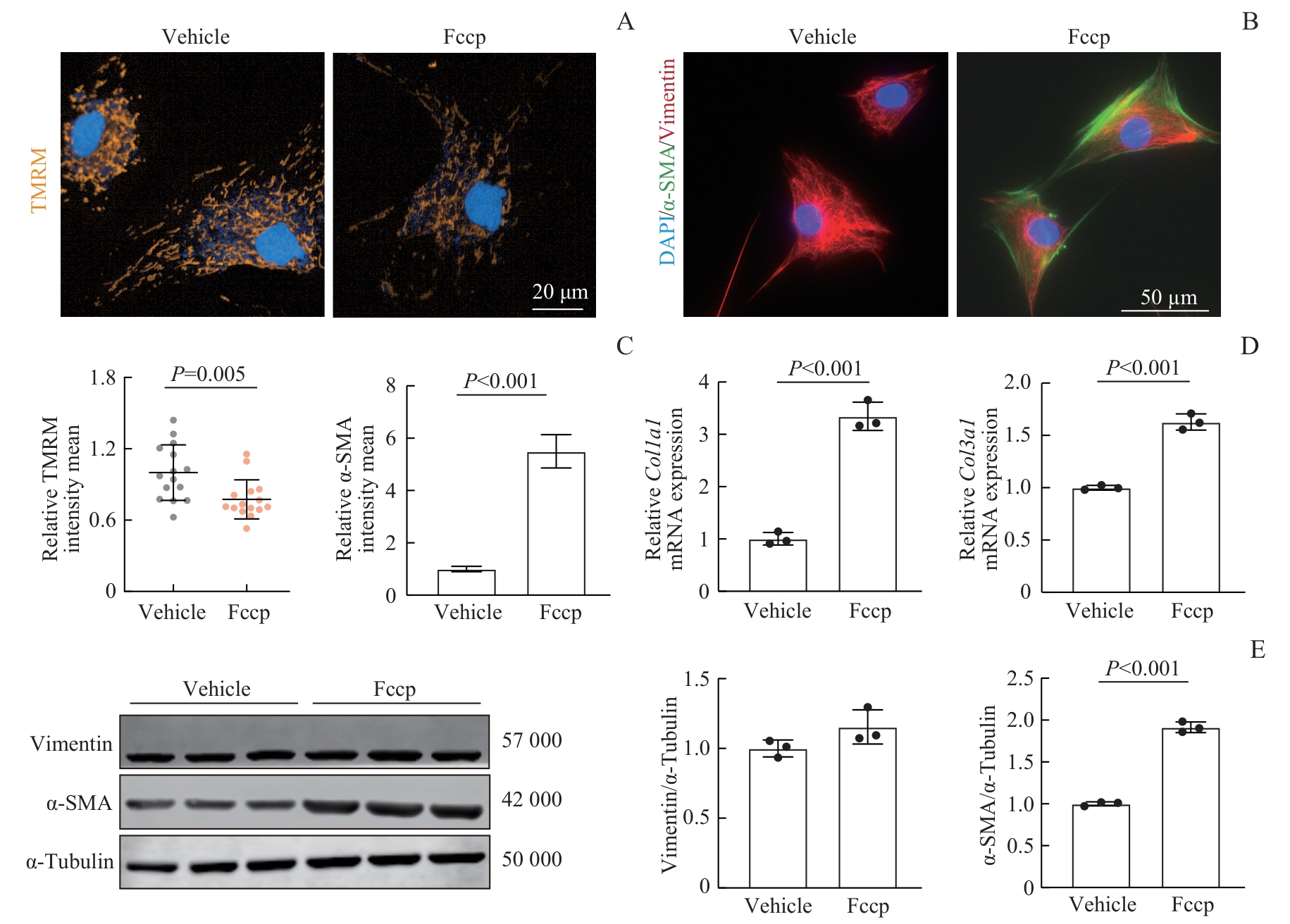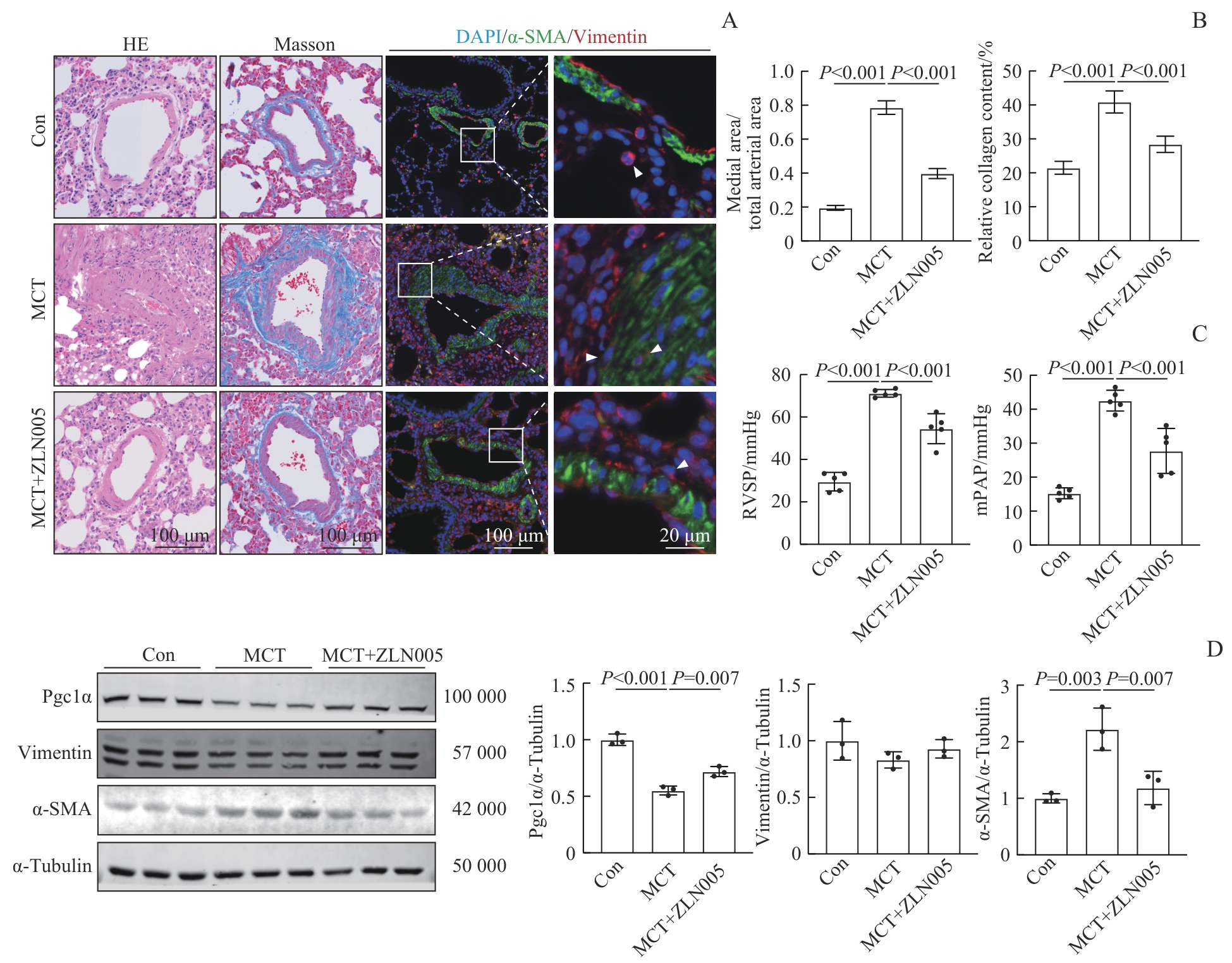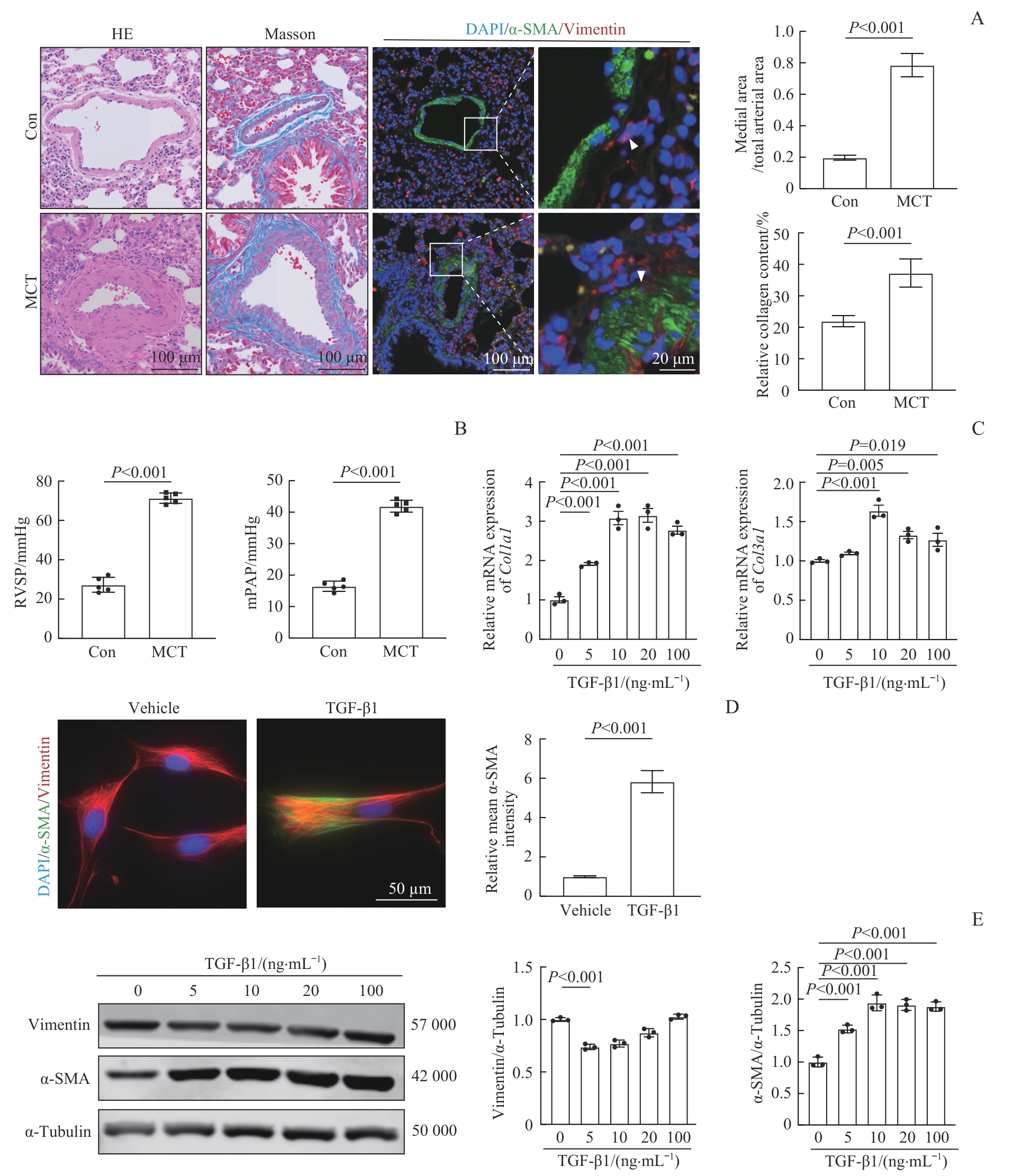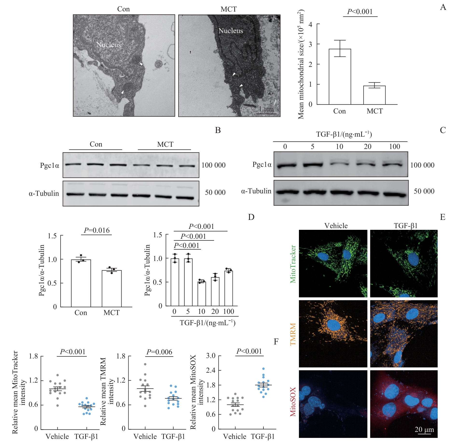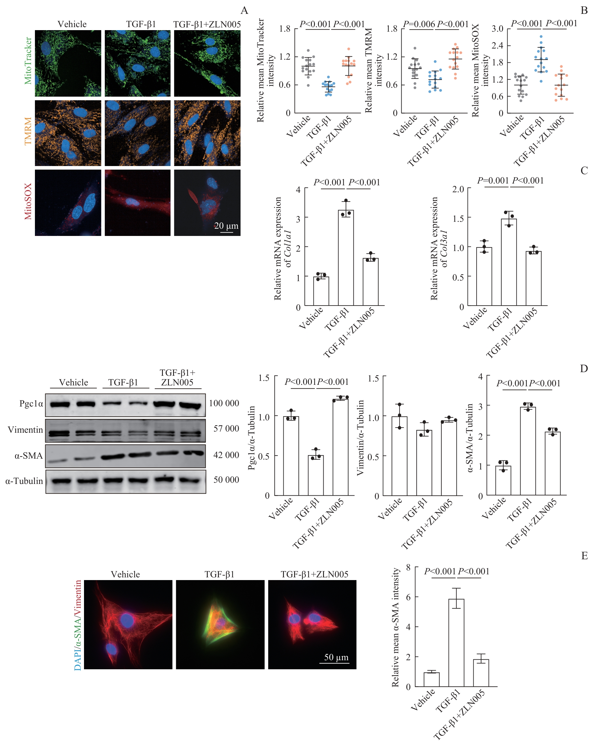 Objective ·To preliminarily investigate the role and mechanism of fibroblast mitochondrial dysfunction and its phenotypic transition in pulmonary arterial hypertension (PAH). Methods ·A PAH model was established in rats by using monocrotaline (MCT). Rat pulmonary arterial adventitial fibroblasts (RPAAFs) were isolated and stimulated with transforming growth factor β1 (TGF-β1) to induce fibroblast-to-myofibroblast transition (FMT). Interventions were performed using the peroxisome proliferator-activated receptor γ coactivator 1-α (Pgc1α) agonist ZLN005 and the mitochondrial uncoupler Fccp. Hemodynamic parameters were measured via right heart catheterization. Vascular remodeling was assessed by using hematoxylin-eosin staining and immunofluorescence staining. Mitochondrial morphology and function were observed by using transmission electron microscopy and live-cell staining (Mitotracker, TMRM, and MitoSOX). The expression levels of Pgc1α, vimentin, and smooth muscle actin α (α-SMA) were detected by Western blotting. The mRNA expression levels of Col1a1 and Col3a1 were measured by qPCR. Results ·Four weeks after MCT injection, mitochondria in rat pulmonary arterial adventitial fibroblasts became fragmented with a reduced mean area (P<0.001), and the protein expression level of Pgc1α decreased (P=0.016), promoting the transition of fibroblasts into myofibroblasts. After stimulation with TGF-β1, RPAAFs showed reduced mitochondrial number (P<0.001), decreased membrane potential (P=0.006), increased reactive oxygen species (P<0.001), decreased Pgc1α expression (P=0.006), significantly increased α-SMA protein expression, and increased Col1a1 and Col3a1 mRNA expression (all P<0.001). Fccp treatment similarly reduced mitochondrial membrane potential (P=0.005) and increased α-SMA, Col1a1, and Col3a1 expression (all P<0.001). Pretreatment with ZLN005 upregulated Pgc1α expression (P<0.001), improved TGF-β1-induced mitochondrial dysfunction, and suppressed α-SMA expression (P<0.001) in fibroblasts. In vivo, ZLN005 attenuated pulmonary artery remodeling, reduced perivascular collagen deposition, lowered right ventricular systolic pressure and mean pulmonary arterial pressure (both P<0.001), upregulated tissue Pgc1α expression, and inhibited α-SMA expression (P=0.007). Conclusion ·Fibroblast mitochondrial dysfunction promotes FMT and plays an important role in the pathophysiology of PAH.