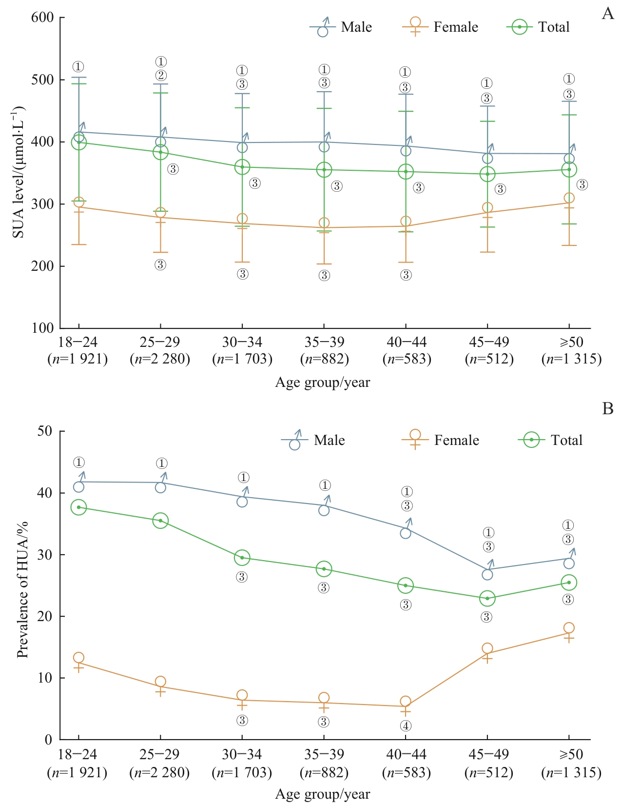 Objective ·To analyze the prevalence of hyperuricemia (HUA) and its correlation with metabolic syndrome (MS) and MS components among adults in the Ningbo Hangzhou Bay area of Zhejiang Province. Methods ·A cross-sectional study was conducted among adults who underwent health examinations at Ningbo Hangzhou Bay Hospital from January to December 2022. Demographic data and clinical examination results were collected. The prevalence of HUA was calculated based on serum uric acid (SUA) levels. The estimated glomerular filtration rate (eGFR) was calculated using the Chronic Kidney Disease Epidemiology Collaboration equation. MS was defined according to body mass index (BMI), blood pressure, fasting blood glucose, triglycerides (TG), and high-density lipoprotein cholesterol (HDL-C). The association between HUA and MS, as well as its individual components, was analyzed. Results ·A total of 9 196 adults were included, with a mean age of (34.3±11.8) years; 75.2% were males. The mean SUA level was (371.8±95.6) μmol/L, and the overall prevalence of HUA was 31.3%. Compared with the non-HUA group, the HUA group demonstrated a higher proportion of males, younger age, lower eGFR, and a higher prevalence of MS (all P<0.001). Regarding MS components, the HUA group showed significantly higher BMI, blood pressure, and TG levels, along with lower HDL-C levels (all P<0.001). Patients with MS had significantly higher SUA levels and a higher prevalence of HUA compared to those without MS (both P<0.001). Furthermore, both SUA levels and the prevalence of HUA increased progressively with the increasing number of MS components present. Multivariable Logistic regression analysis identified male sex (OR=3.74, 95%CI 3.12‒4.48), younger age (per 5-year decrease, OR=1.22, 95%CI 1.19‒1.26), eGFR<90 mL/(min·1.73 m2) (OR=2.45, 95%CI 2.11‒2.84), BMI≥25 kg/m2 (OR=2.31, 95%CI 2.06‒2.60), elevated blood pressure (OR=1.18, 95%CI 1.04‒1.32), TG≥1.7 mmol/L (OR=2.08, 95%CI 1.81‒2.37), and low HDL-C (OR=1.33, 95%CI 1.15‒1.55) as independent risk factors for HUA. Conclusion ·The prevalence of HUA is high among the adult population in the Ningbo Hangzhou Bay area. Male sex, younger age, decreased renal function, and the presence of MS components are risk factors for HUA in this population, with the prevalence increasing as the number of MS components accumulates.