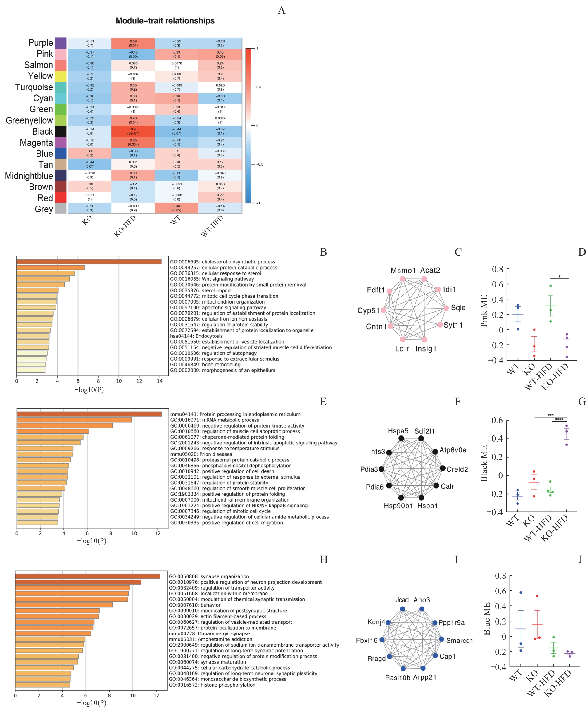 | 图1 高脂饮食喂养前后 WT 和 Trpv1 敲除的小鼠的WGCNA Note: A. Modules of WT, KO, WT-HFD, and KO-HFD mice (n=3 mice in WT and KO group, n=4 mice in WT-HFD and KO-HFD group). B/E/H. Top 20 pathways of GO and KEGG enrichment analysis of the pink, black and blue module. C/F/I. Network plot of the top 10 genes in pink, black and blue module. D/G/J. Trajectory of the module eigengenes in pink, black and blue module. One-way ANOVA was applied. *P < 0.05, ***P < 0.001, ****P = 0.000. |