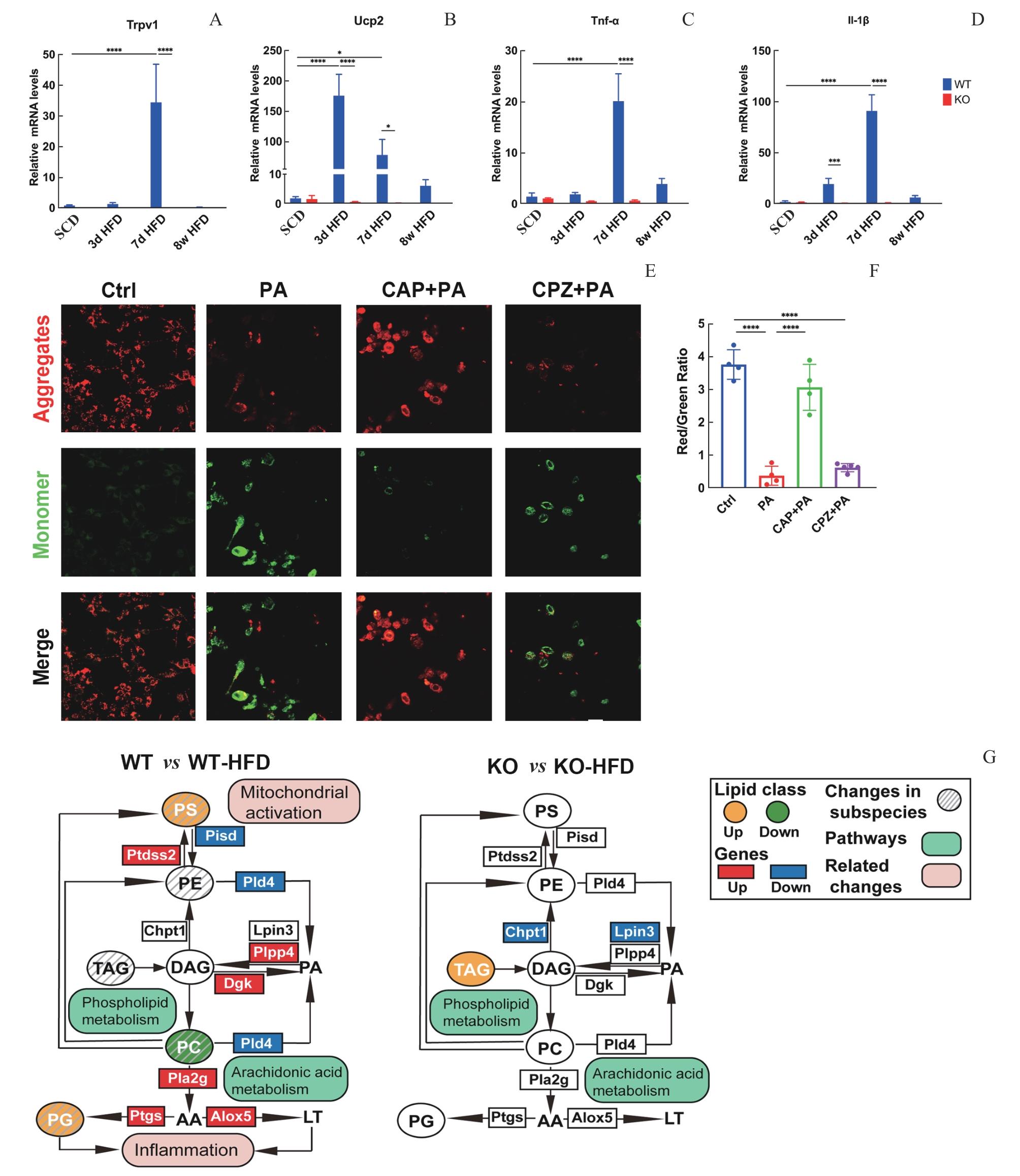 | 图7 Trpv1 敲除可减轻高脂饮食诱导的神经炎症和线粒体激活 Note: A—D. The mRNA levels of Trpv1, Ucp2, Tnf-α, and Il-1β in isolated cortical microglia (CD11b+ cells) from WT and KO mice mixed gender fed on SCD, 3 d HFD, 7 d HFD, or 8-week HFD (n=3). E/F. Mitochondrial membrane potential was detected by fluorescence microscopy (n=3). G. Indications of quantified lipid classes and acyl chains (circles) and genes (rectangles) of WT and KO mice by HFD. Data represent x±s. ?P < 0.05, ****P = 0.000. Scale bar: 50 μm. |
