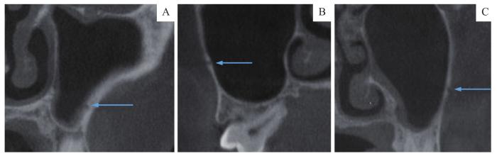 (2)MSA走形类型:按照走形位置与上颌窦侧壁的关系,对MSA走形(图1)分类为窦内型(位于上颌窦黏膜下方)、骨内型(完全位于上颌窦侧壁骨壁内)、表浅型(位于上颌窦侧壁骨膜下方)。
