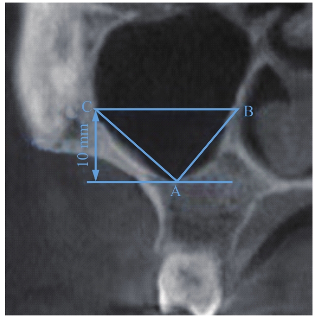 | 图2 M1牙位上颌窦角度测量方法 Note: Point A—The bottom of maxillary sinus in M1 tooth position; Point B—The intersection point of the parallel line and the medial wall of maxillary sinus; Point C—The intersection point of the parallel line and the lateral wall of maxillary sinus. |