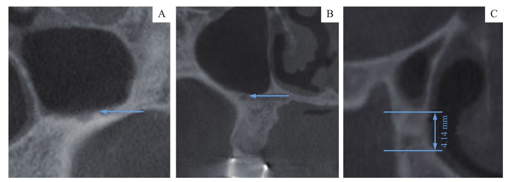 | 图3 MSA走形位置变异 Note:A.The MSA was located at the bottom of maxillary sinus. B. The MSA was located in the root apical of molars. C. The MSA was located in the alveolar bone 4.14 mm from maxillary sinus floor. |