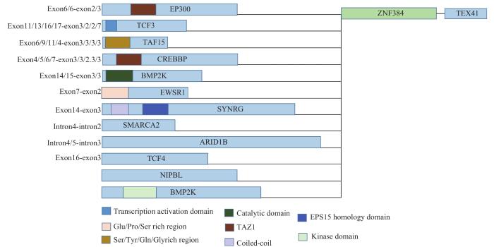 Breakpoint statistics and fusion protein structure diagram of some ZNF384 fusion subtypes