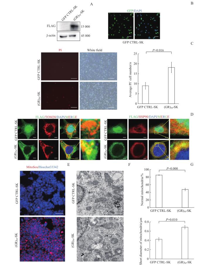 Note: A. Detection of FLAG-tag protein expression in cells by Western blotting. B. Observation of GFP signal in GFP CTRL-SK cells by fluorescence microscope. Scale bar=50 μm. C. Detection of cell apoptosis level by PI staining. Scale bar=50 μm. D. Detection of subcellular location of (GR)50 and TOM20 or HSP90 by IF. Scale bar=1 μm. E. Detection of mitochondrial ROS level of (GR)50-SK and GFP CTRL-SK cells by MitoSOX Red superoxide indicator staining. Red fluorescence represents intracellular ROS, and blue fluorescence represents DAPI-stained nucleus. Scale bar=100 μm. F. Observation of mitochondrial morphology and structure of cells by transmission electron microscope. Scale bar=2 μm. G. Quantification analysis of the proportion of normal mitochondria and length of mitochondrial short diameter.