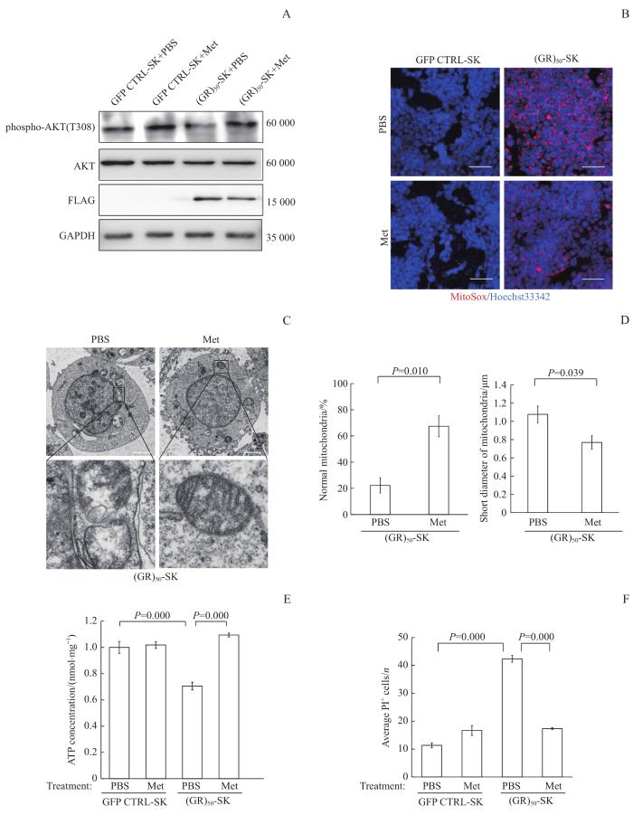 为明确二甲双胍能否有效改善由(GR)50导致的AKT磷酸化水平降低,本研究采用二甲双胍分别处理(GR)50-SK、GFP CTRL-SK细胞后,通过Western blotting、MitoSOX Red超氧化物指示剂染色、透射电子显微镜观察、ATP浓度检测、PI染色等评估细胞的AKT及其磷酸化水平、线粒体ROS水平、线粒体形态、线粒体生成ATP的能力及细胞凋亡水平。结果如图3所示。Western blotting的结果(图3A)显示,与PBS处理组相比,二甲双胍可有效恢复(GR)50-SK细胞中的AKT磷酸化水平,但对GFP CTRL-SK细胞的AKT磷酸化水平无影响;MitoSOX Red染色的结果(图3B)显示,与PBS处理组相比,二甲双胍可显著降低(GR)50-SK细胞的线粒体ROS水平,但对GFP CTRL-SK细胞无影响;透射电子显微镜的观察结果及定量分析的结果(图3C、D)显示,与PBS处理组相比,二甲双胍可有效促进(GR)50-SK细胞中线粒体嵴结构重塑,其正常形态的线粒体数量有所增加(P=0.010);ATP检测的结果(图3E)则显示,(GR)50-SK细胞中的ATP浓度较GFP CTRL-SK细胞有所下降(P=0.000),而与PBS处理的(GR)50-SK细胞相比,二甲双胍可显著提高该细胞中的ATP浓度(P=0.000),提示二甲双胍可有效修复由(GR)50导致的线粒体ATP生成能力受损;PI染色的结果(图3F)显示,与PBS处理组相比,二甲双胍处理组的(GR)50-SK细胞中PI阳性细胞数明显减少(P=0.000),提示二甲双胍可有效降低由(GR)50诱导的细胞凋亡。