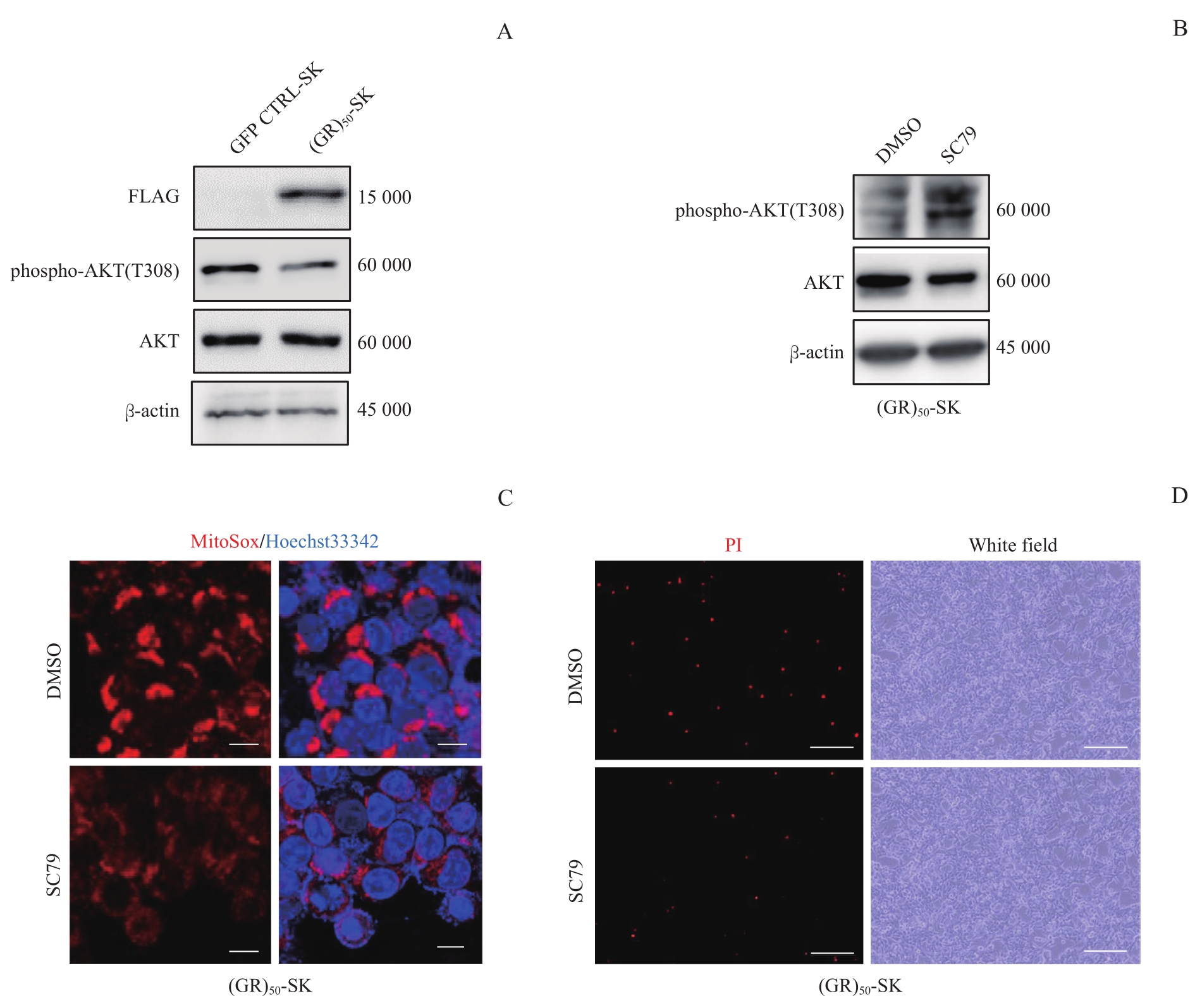 | 图2 (GR)50 对AKT磷酸化水平的影响及调控AKT磷酸化对线粒体ROS水平、细胞凋亡水平的影响 Note: A. Detection of the expression levels of AKT and phosphorylated AKT in cells by Western blotting. B. Detection of the effect of SC79 on AKT and phosphorylated AKT levels in (GR)50-SK cells by Western blotting. C. Detection of the effect of SC79 on mitochondrial ROS level of (GR)50-SK cells by MitoSOX Red superoxide indicator staining. Red fluorescence represents intracellular ROS, and blue fluorescence represents DAPI-stained nucleus. Scale bar=10 μm. D. Detection of the effect of SC79 on cell apoptosis level by PI staining. Scale bar=100 μm. |