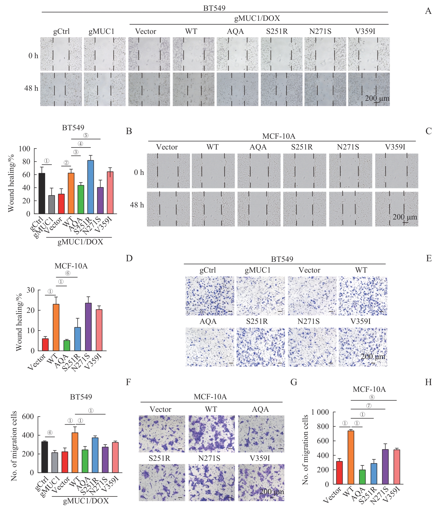 | 图5 MUC1-WT及其突变体对细胞迁移的影响 Note: A/B. Wound healing assay of BT549 cells expressing MUC1-WT or mutants. Representative images of cells at 0 h and 48 h (A, ×200) and corresponding statistical analysis (B). C/D. Wound healing assay of MCF-10A cells expressing MUC1-WT or mutants. Representative images of cells at 0 h and 48 h (C, ×200) and corresponding statistical analysis (D). E/F. Transwell migration analysis of BT549 cells expressing MUC1-WT or mutants. Representative crystal violet-stained images (E, ×100) and corresponding statistical analysis (F). G/H. Transwell migration analysis of MCF-10A cells expressing MUC1-WT or mutants. Representative crystal violet-stained images (G, ×100) and corresponding statistical analysis (H). ①P<0.001, ②P=0.004, ③P=0.014, ④P=0.030, ⑤P=0.025, ⑥P=0.003, ⑦P=0.050, ⑧P=0.042. |