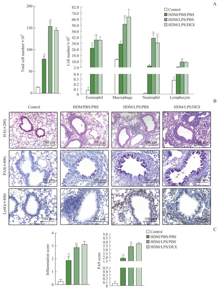 Note: A. The flow cytometry results of the inflammatory cell counts (eosinophils, lymphocytes, macrophages and neutrophils) in the BALF of mice in each group. B. Pathological sections of mouse lung tissue: H-E staining (×200), PAS staining (×400), Ly6G immunohistochemical staining (×400). C. Eosinophil and airway inflammation scores. ①P<0.001, ④P=0.010, compared with the control group; ②P<0.001, ③P=0.025, ⑤P=0.005, ⑥P=0.023, compared with the HDM/PBS/PBS group.