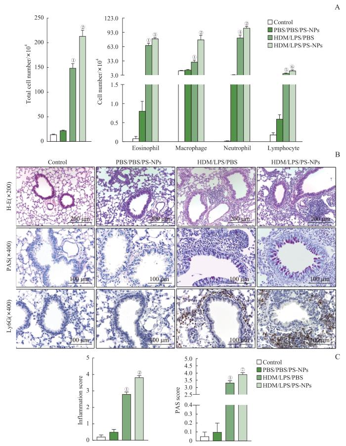 Note: A. The flow cytometry results of the inflammatory cell (eosinophils, lymphocytes, macrophages and neutrophils) counts in the BALF of mice in each group after exposure to PS-NPs. B. Pathological sections of mouse lung tissue, including H-E staining (×200), PAS staining (×400), Ly6G immunohistochemical staining (×400). C. Eosinophil and airway inflammation scores. ①P<0.001, ④P=0.035, ⑤P=0.002, compared with the control group; ②P<0.001, ③P=0.001, ⑥P=0.008, ⑦P=0.002, compared with the HDM/LPS/PBS group.