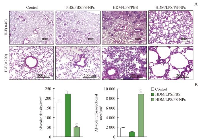 Note: A. Mouse lung alveolar pathological sections stained with H-E (×40, ×200). B. Analysis of alveolar density and alveolar cross-sectional area. ①P<0.001, compared with the HDM/LPS/PBS group.