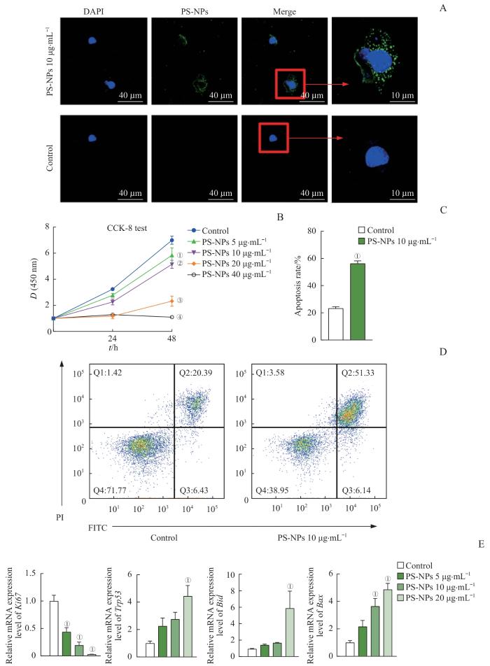 Note: A. Confocal microscopy shows the distribution of PS-NPs in MLE-12 cells, namely AT2 cells (×1 000, ×4 000). AT2 cells were stained with PS-NP (green) and DAPI (blue). B. The effect of PS-NPs (5, 10, 20, 40 μg·mL-1) on the proliferation of AT2 cells after 0, 24 or 48 h. C/D. Analysis of the effect of PS-NPs on apoptosis of AT2 cells by Annexin-Ⅴ FITC/PI staining. E. The effect of PS-NPs exposure on the expression levels of proliferation and apoptosis-related genes Ki67, Bax, Bid, and Trp53 in AT2 cells. ①P<0.001, compared with the control group; ②P=0.025, compared with the PS-NPs 5 μg·mL-1 group; ③P<0.001, compared with the PS-NPs 10 μg·mL-1 group; ④P<0.001, compared with the PS-NPs 20 μg·mL-1 group.