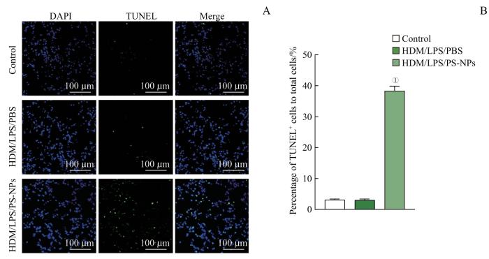 Note: A. TUNEL staining of mouse alveolar pathological sections (×400). AT2 cells were stained with TUNEL (green) and DAPI (blue). B. The results of apoptosis rates in each group. ①P<0.001, compared with the HDM/LPS/PBS group.