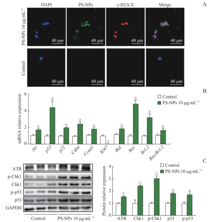 Note: A. Immunofluorescence method to detect the effect of PS-NPs on DNA damage of AT2 cells (×1 000). AT2 cells were co-stained with γ-H2A.X (red) and PS-NPs (green) and DAPI (blue). B. qPCR analysis of the expression of ATR/Chk1/p53 signaling pathway and apoptosis-related genes in MLE-12 cells after exposure to PS-NPs. C. Western blotting analysis of the expression and phosphorylation of ATR, Chk1, and p53 proteins after exposure to PS-NPs. ①P=0.013, ②P=0.001, ③P=0.000, ④P=0.006, ⑤P=0.007, ⑥P=0.042, ⑦P=0.004, ⑧P=0.012, compared with the control group. GAPDH—glyceraldehyde-3-phosphate dehydrogenase.