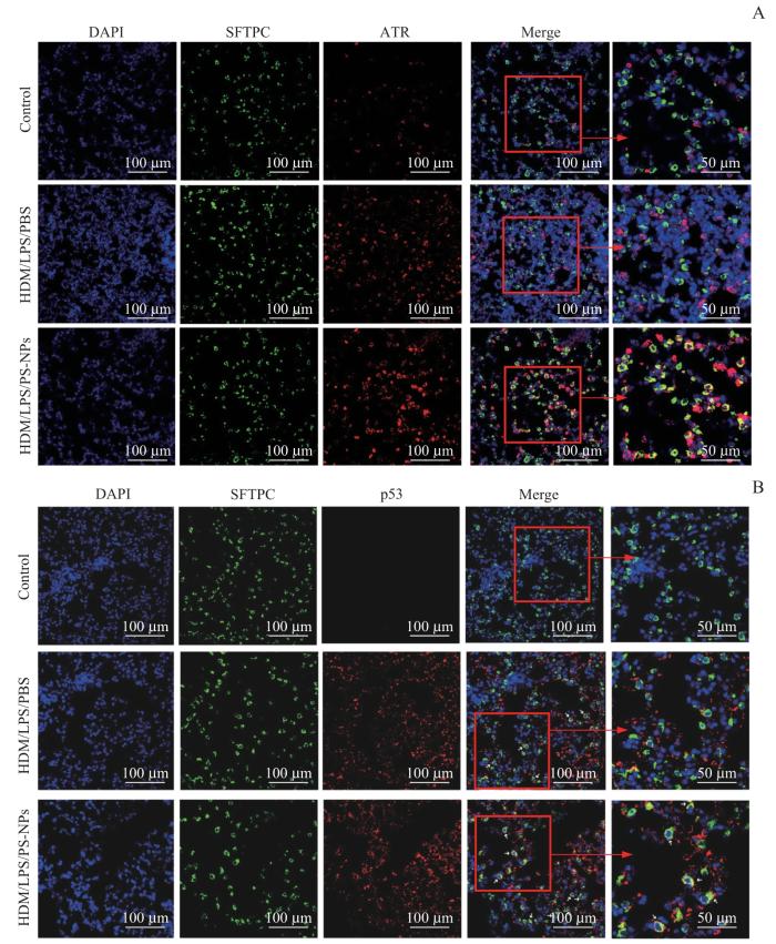 In vivo experiments confirmed that the upregulated expression levels of ATR and p53 in Sftpc+ AT2 cells of severe asthma mice after PS-NPs exposure