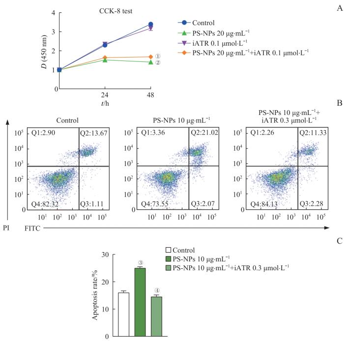 将分装有5 mg Ceralasertib粉末的2 mL微型离心管以4 ℃ 1 500×g离心5 min,随后每管中加入121.2 μL二甲基亚砜(DMSO)吹打振荡至完全溶解,得到100 mmol/L Ceralasertib溶液,置于-20 ℃冰箱储存。准备好接种有MLE-12细胞的96孔板,方法同“1.2.5(1)”,分为空白对照组、PS-NPs组、iATR组和PS-NPs+iATR组,隔日贴壁;在CCK-8实验前预解冻100 mmol/L Ceralasertib溶液。分别制备含有0.1 μmol/L Ceralasertib的培养基,及不含Ceralasertib但含有同等浓度DMSO的培养基;PS-NPs+iATR组及iATR组在PS-NPs暴露前,在含有0.1 μmol/L Ceralasertib的培养基中预处理2 h,其他组给予含有同等浓度DMSO的培养基作为对照;2 h后,PS-NPs+iATR组及PS-NPs组更换为含20 μg/mL PS-NPs的培养基,空白对照组、iATR组更换为不含PS-NPs的培养基,后续CCK-8孵育、检测同“1.2.5(1)”。